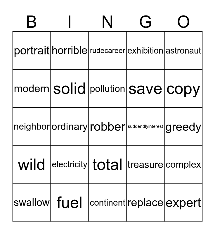 This bingo card has a free space and 24 words: electricity, fuel, pollution, swallow, astronaut, portrait, modern, horrible, suddendlyinterest, total, save, neighbor, treasure, complex, solid, replace, greedy, rudecareer, copy, ordinary, expert, wild, exhibition and continent.