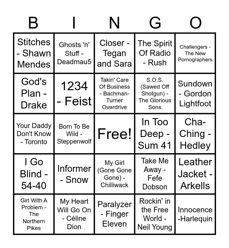 This bingo card has a free space and 79 words: American Woman - The Guess Who, Help I'm Alive - Metric, Closer - Tegan and Sara, Can't Feel My Face - The Weeknd, Hallelujah - Leonard Cohen, Working for the Weekend - Loverboy, Love Is - Alannah Myles, Desperate Measures - Marianas Trench, Making It Work - Doug and the Slugs, Man! I Feel Like A Woman! - Shania Twain, Superman's Dead - Our Lady Peace, Pinball King - Terra Lightfoot, The Spirit Of Radio - Rush, Stitches - Shawn Mendes, I'm An Adult Now - The Pursuit Of Happiness, God's Plan - Drake, The Safety Dance - Men Without Hats, Informer - Snow, I'm Like A Bird - Nelly Furtado, Cha-Ching - Hedley, Body - Loud Luxury Brando, Challengers - The New Pornographers, Your Daddy Don't Know - Toronto, Takin' Care Of Business - Bachman-Turner Overdrive, 1234 - Feist, Feel It Again - Honeymoon Suite, When She Loved Me - Sarah McLachlan, Hayloft - Mother Mother, Call Me Maybe - Carly Rae Jepsen, Feeling Good - Michael Bublé, Sundown - Gordon Lightfoot, Bobcaygeon - The Tragically Hip, Paralyzer - Finger Eleven, Tongue Tied - Faber Drive, Girl With A Problem - The Northern Pikes, In Too Deep - Sum 41, Sweet City Woman - Stampeders, Complicated - Avril Lavigne, Sucks To Be You - Prozzak, Innocence -Harlequin, Eyes Of A Stranger - The Payolas, The Rest of My Life - Sloan, Drinking in L.A - Bran Van 3000, Good Mother - Jann Arden, Patio Lanterns - Kim Mitchell, Ghosts 'n' Stuff - Deadmau5, Summer Of ‘69 - Bryan Adams, Push - Moist, Roller - April Wine, Lover's In A Dangerous Time - Bruce Cockburn, Leather Jacket - Arkells, Born To Be Wild - Steppenwolf, Take Me Away - Fefe Dobson, Tired of Waiting - The Trews, Baby - Justin Bieber Ludacris, One Week - Barenaked Ladies, She's so High - Tal Bachman, Hasn't Hit Me Yet - Blue Rodeo, Sunglasses at Night - Corey Hart, My Girl (Gone Gone Gone) - Chilliwack, S.O.S. (Sawed Off Shotgun) - The Glorious Sons, The Hockey Song - Stompin' Tom Connors, Riot - Three Days Grace, Blame Brett - The Beaches, Whoa Is Me - Down With Webster, Grow Up - Simple Plan, Red Hands - Walk off the Earth, How You Remind Me - Nickleback, Skinnamarink - Sharon Lois & Bram, I Go Blind - 54-40, My Heart Will Go On - Céline Dion, Big Yellow Taxi - Joni Mitchell, We're Here For A Good Time - Trooper, Ordinary Day - Great Big Sea, Lay It on the Line - Triumph, Rockin' in the Free World - Neil Young, Ready to Start - Arcade Fire, Ironic - Alanis Morissette and Greedy - Tate McRae.