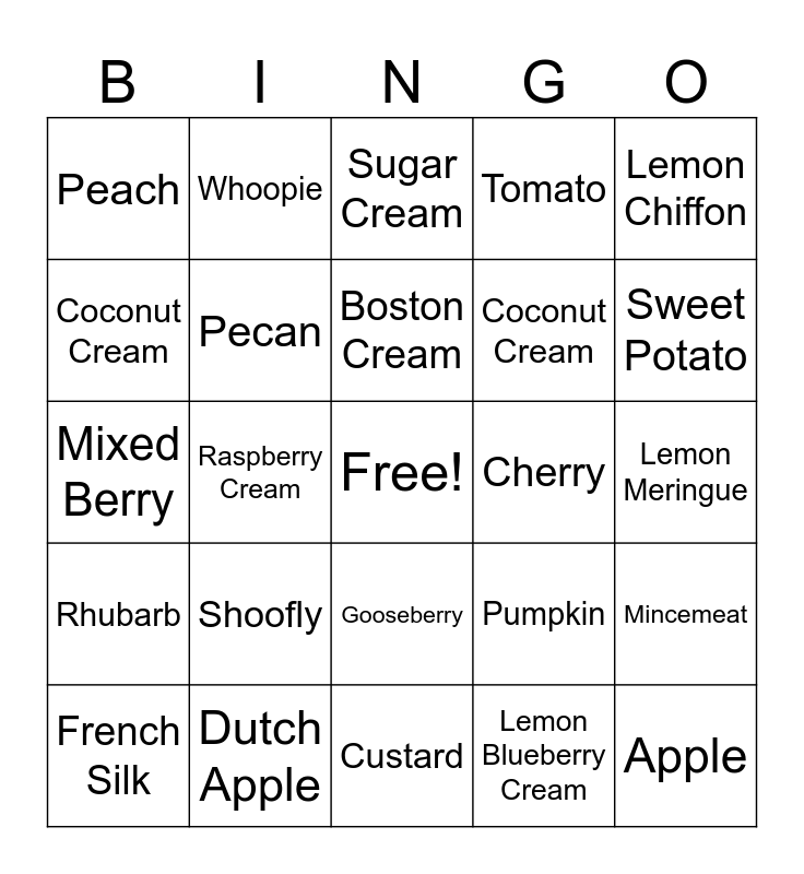 This bingo card has a free space and 29 words: Key Lime, Dutch Apple, Sugar Cream, Peanut Butter Cream, Lemon Chiffon, Peach, Pecan, Boston Cream, Cherry, Mincemeat, French Silk, Raspberry Cream, Lemon Blueberry Cream, Apple, Mixed Berry, Banana Cream, Custard, Pumpkin, Sweet Potato, Rhubarb, Shoofly, Strawberry, Coconut Cream, Lemon Meringue, Coconut Cream, Whoopie, Gooseberry, Tomato and Lemon Chiffon.