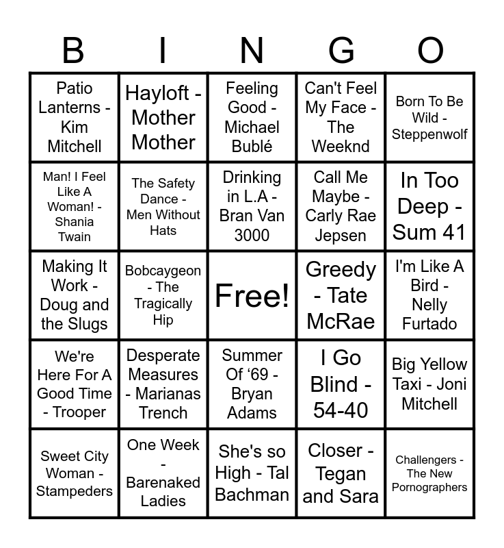 This bingo card has a free space and 79 words: Lay It on the Line - Triumph, Body - Loud Luxury Brando, Feeling Good - Michael Bublé, Stitches - Shawn Mendes, Superman's Dead - Our Lady Peace, Working for the Weekend - Loverboy, Take Me Away - Fefe Dobson, Love Is - Alannah Myles, Innocence - Harlequin, Eyes Of A Stranger - The Payolas, Paralyzer - Finger Eleven, Sunglasses at Night - Corey Hart, Can't Feel My Face - The Weeknd, Patio Lanterns - Kim Mitchell, Your Daddy Don't Know - Toronto, Man! I Feel Like A Woman! - Shania Twain, Tired of Waiting - The Trews, Desperate Measures - Marianas Trench, Lover's In A Dangerous Time - Bruce Cockburn, I'm Like A Bird - Nelly Furtado, Red Hands - Walk off the Earth, Born To Be Wild - Steppenwolf, Making It Work - Doug and the Slugs, Drinking in L.A - Bran Van 3000, The Safety Dance - Men Without Hats, My Girl (Gone Gone Gone) - Chilliwack, Baby - Justin Bieber Ludacris, I'm An Adult Now - The Pursuit Of Happiness, How You Remind Me - Nickleback, Help I'm Alive - Metric, In Too Deep - Sum 41, Hasn't Hit Me Yet - Blue Rodeo, She's so High - Tal Bachman, Leather Jacket - Arkells, Sweet City Woman - Stampeders, Greedy - Tate McRae, Feel It Again - Honeymoon Suite, Ironic - Alanis Morissette, Rockin' in the Free World - Neil Young, Challengers - The New Pornographers, Skinnamarink - Sharon Lois & Bram, Takin' Care Of Business - Bachman-Turner Overdrive, Complicated - Avril Lavigne, When She Loved Me - Sarah McLachlan, Informer - Snow, Hayloft - Mother Mother, The Spirit Of Radio - Rush, Hallelujah - Leonard Cohen, Grow Up - Simple Plan, Pinball King - Terra Lightfoot, Big Yellow Taxi - Joni Mitchell, Bobcaygeon - The Tragically Hip, I Go Blind - 54-40, S.O.S. (Sawed Off Shotgun) - The Glorious Sons, Tongue Tied - Faber Drive, Ready to Start - Arcade Fire, The Rest of My Life - Sloan, My Heart Will Go On - Céline Dion, Push - Moist, Summer Of ‘69 - Bryan Adams, Call Me Maybe - Carly Rae Jepsen, Cha-Ching - Hedley, Blame Brett - The Beaches, Girl With A Problem - The Northern Pikes, Roller - April Wine, Good Mother - Jann Arden, Whoa Is Me - Down With Webster, The Hockey Song - Stompin' Tom Connors, American Woman - The Guess Who, We're Here For A Good Time - Trooper, One Week - Barenaked Ladies, God's Plan - Drake, Ordinary Day - Great Big Sea, Riot - Three Days Grace, 1234 - Feist, Closer - Tegan and Sara, Sucks To Be You - Prozzak, Sundown - Gordon Lightfoot and Ghosts 'n' Stuff - Deadmau5.