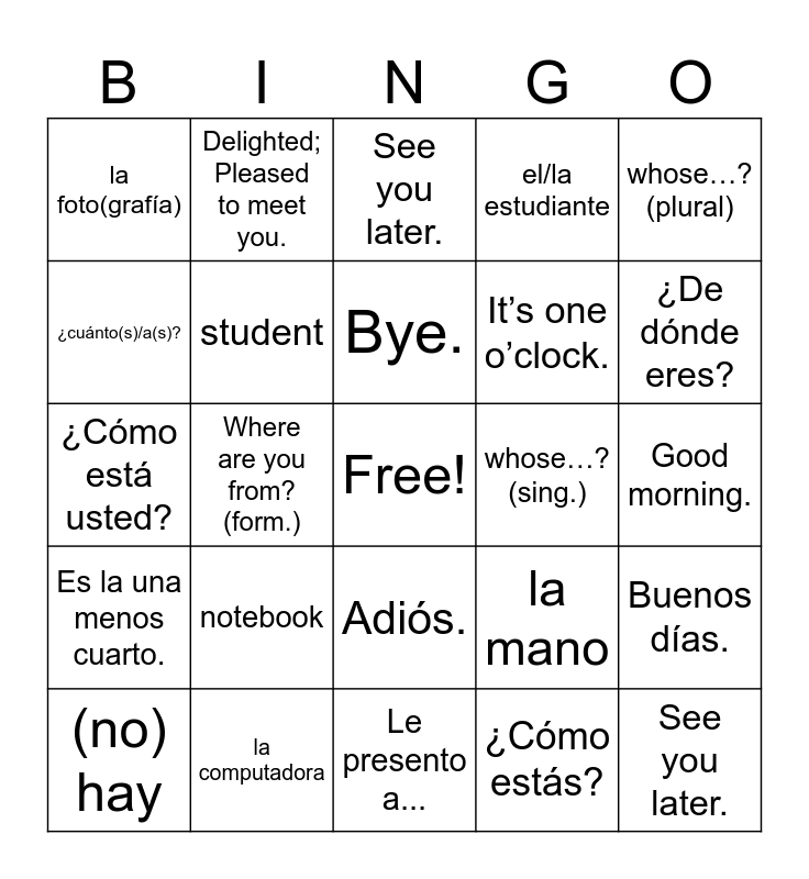 This bingo card has a free space and 86 words: ¿A qué hora es la clase de biología?, At what time is biology class?, Adiós., Goodbye., el autobús, bus, (Muy) bien, gracias., (Very) well, thanks., Buenas noches., Good evening; good night., Buenas tardes., Good afternoon., Buenos días., Good morning., Chau., Bye., la chica, girl, el chico, boy, La clase es a las dos., The class is at two o'clock., ¿Cómo está usted?, How are you? (form.), ¿Cómo estás?, How are you? (fam.), ¿Cómo se llama usted?, What’s your name? (form.), ¿Cómo te llamas?, What’s your name? (fam.), la computadora, computer, el cuaderno, notebook, ¿cuánto(s)/a(s)?, how much/many?, ¿De dónde eres?, Where are you from? (fam.), ¿De dónde es usted?, Where are you from? (form.), De nada., You’re welcome., ¿de quién...?, whose…? (sing.), ¿de quiénes...?, whose…? (plural), Encantado/a., Delighted; Pleased to meet you., Es el mediodía., It is noon., Es la medianoche., It is midnight., Es la una menos cuarto., It is a quarter to one., Es la una y cuarto., It is a quarter past one., Es la una., It’s one o’clock., el/la estudiante, student, la foto(grafía), photograph, (Muchas) gracias., Thank you (very much); Thanks (a lot)., Hasta la vista., See you later., Hasta luego., See you later., Hasta mañana., See you tomorrow., Hasta pronto., See you soon., (no) hay, there is (not); there are (not), el lápiz, pencil, Le presento a..., I would like to introduce you to (name). (form.), la lección, lesson, Lo siento., I’m sorry., la maleta, suitcase, la mano and hand.