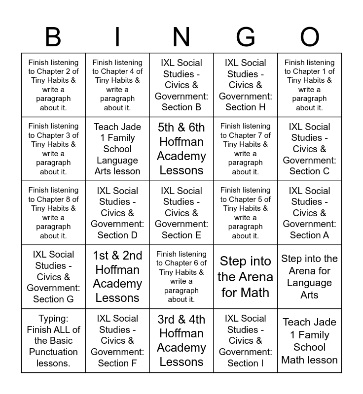 This bingo card has 25 words: 1st & 2nd Hoffman Academy Lessons, 3rd & 4th Hoffman Academy Lessons, 5th & 6th Hoffman Academy Lessons, Typing: Finish ALL of the Basic Punctuation lessons., Finish listening to Chapter 1 of Tiny Habits & write a paragraph about it., Finish listening to Chapter 2 of Tiny Habits & write a paragraph about it., Finish listening to Chapter 3 of Tiny Habits & write a paragraph about it., Finish listening to Chapter 4 of Tiny Habits & write a paragraph about it., Finish listening to Chapter 5 of Tiny Habits & write a paragraph about it., Finish listening to Chapter 6 of Tiny Habits & write a paragraph about it., Finish listening to Chapter 7 of Tiny Habits & write a paragraph about it., Finish listening to Chapter 8 of Tiny Habits & write a paragraph about it., Step into the Arena for Math, Step into the Arena for Language Arts, Teach Jade 1 Family School Language Arts lesson, Teach Jade 1 Family School Math lesson, IXL Social Studies - Civics & Government: Section A, IXL Social Studies - Civics & Government: Section B, IXL Social Studies - Civics & Government: Section C, IXL Social Studies - Civics & Government: Section D, IXL Social Studies - Civics & Government: Section E, IXL Social Studies - Civics & Government: Section F, IXL Social Studies - Civics & Government: Section G, IXL Social Studies - Civics & Government: Section H and IXL Social Studies - Civics & Government: Section I.