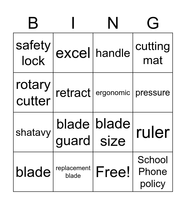 This bingo card has 17 words: Free!, blade, handle, safety lock, blade guard, cutting mat, ruler, ergonomic, pressure, retract, replacement blade, blade size, rotary cutter, excel, shatavy, School ID policy and School Phone policy.