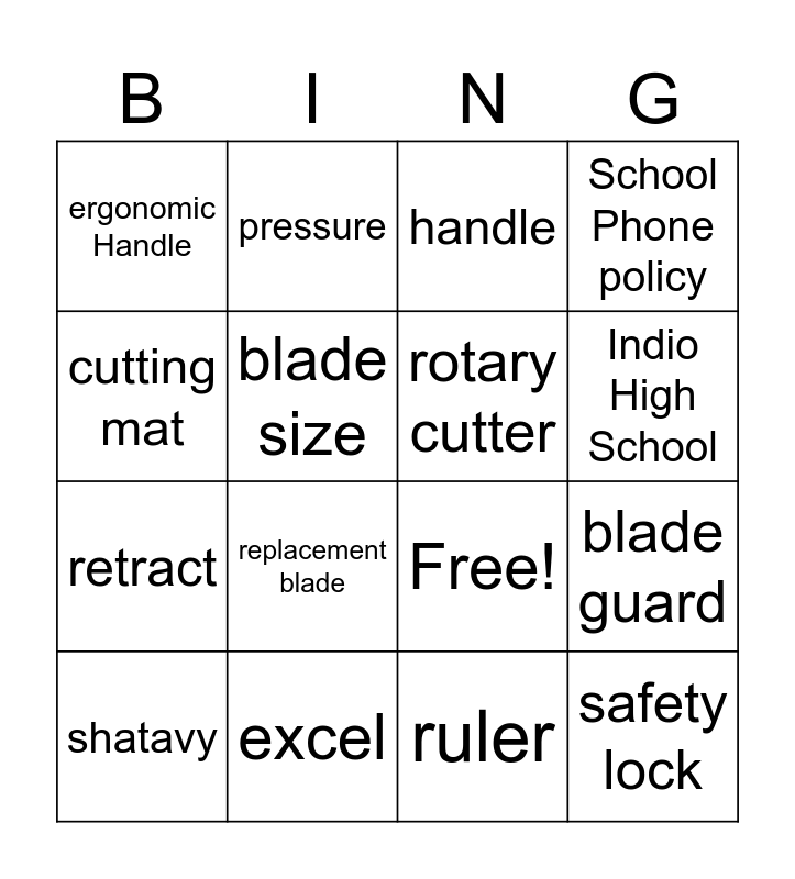 This bingo card has 19 words: Free!, blade, handle, safety lock, blade guard, cutting mat, ruler, ergonomic Handle, pressure, retract, replacement blade, blade size, rotary cutter, excel, shatavy, School ID policy, School Phone policy, Indio High School and Labor Day.