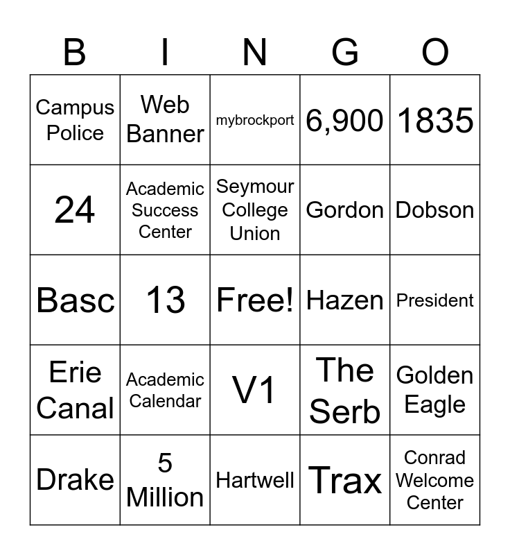 This bingo card has a free space and 24 words: Academic Calendar, 5 Million, Seymour College Union, Drake, 1835, Campus Police, 24, Web Banner, Hazen, V1, Gordon, Basc, The Serb, Golden Eagle, Academic Success Center, Trax, President, mybrockport, Dobson, 13, Conrad Welcome Center, Erie Canal, 6,900 and Hartwell.