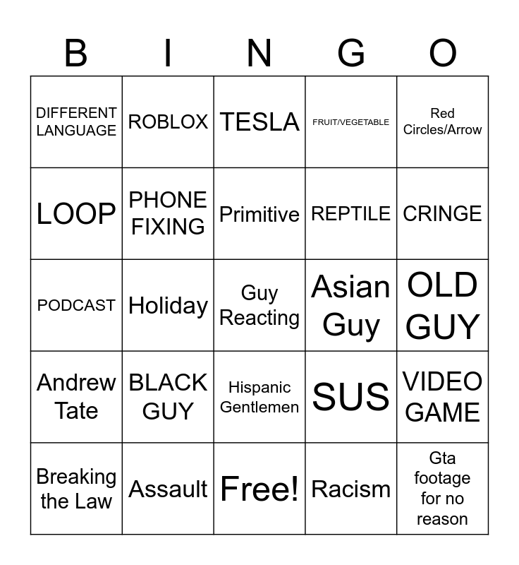 This bingo card has 39 words: SECRET FILMING, BABY, MONEY RELATED, REPTILE, Gta footage for no reason, Andrew Tate, PHONE FIXING, LIFE HACK, FRUIT/VEGETABLE, OLD GUY, LOOP, ROBLOX, Free!, SUS, CRINGE, PODCAST, UNBOXING, TESLA, HACKING, VIDEO GAME, DIFFERENT LANGUAGE, BLACK GUY, Guy Reacting, Asian Guy, EDIT, Breaking the Law, Assault, Narration, Bald Guy, Red Circles/Arrow, Pranks, Cat/Dog, Primitive, Racism, Sigma, Conspiracy, Holiday, Hispanic Gentlemen and Monkeys.