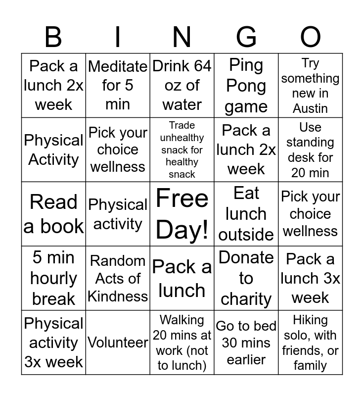 This bingo card has a free space and 24 words: Random Acts of Kindness, Volunteer, Trade unhealthy snack for healthy snack, Physical activity 3x week, Try something new in Austin, Pack a lunch 2x week, Physical Activity, Meditate for 5 min, Eat lunch outside, Pack a lunch, Pack a lunch 2x week, Read a book, Donate to charity, Pack a lunch 3x week, Pick your choice wellness, Go to bed 30 mins earlier, Pick your choice wellness, Drink 64 oz of water, Use standing desk for 20 min, Physical activity, Hiking solo, with friends, or family, 5 min hourly break, Ping Pong game and Walking 20 mins at work (not to lunch).