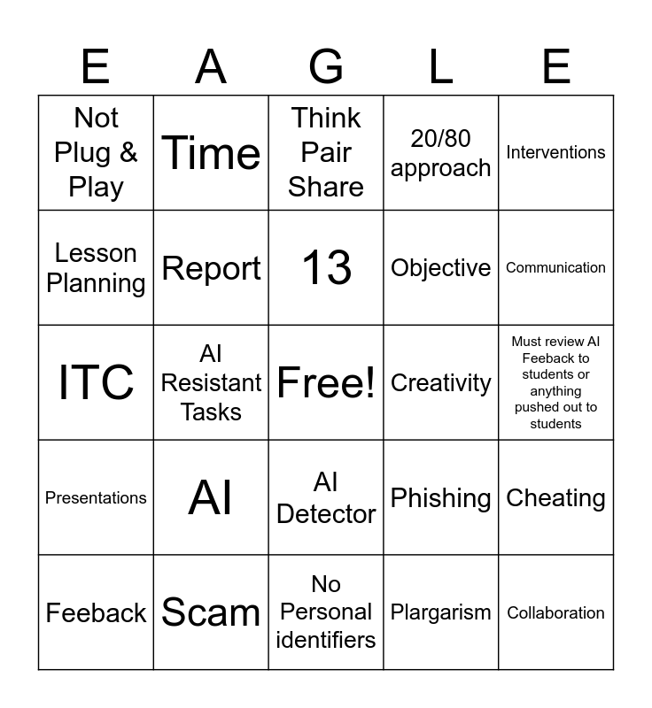 This bingo card has a free space and 24 words: AI, Scam, 13, Feeback, Interventions, Not Plug & Play, Lesson Planning, Time, Creativity, AI Detector, Objective, ITC, Phishing, Cheating, Report, Plargarism, Must review AI Feeback to students or anything pushed out to students, Think Pair Share, Communication, AI Resistant Tasks, Collaboration, Presentations, 20/80 approach and No Personal identifiers.