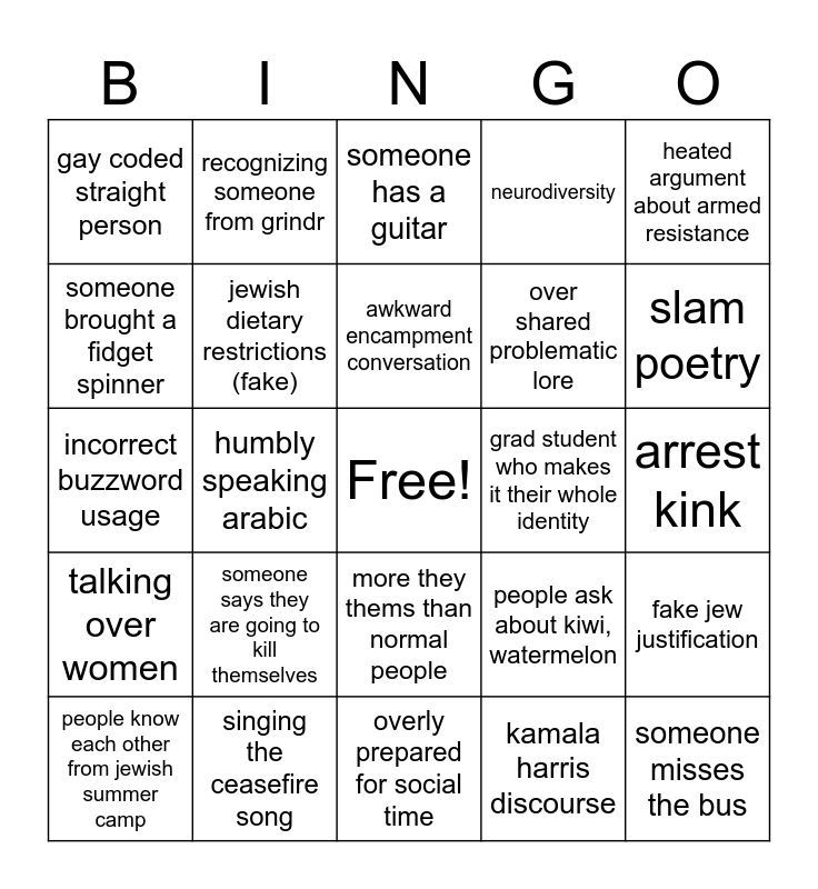 This bingo card has a free space and 35 words: Nate cohen has his dogs out, Nate cohen names something, grounded in your body, jewish dietary restrictions (fake), more they thems than normal people, neurodiversity, someone brought a fidget spinner, as a “fill in marginalized identity”, awkward encampment conversation, know it all teach in, incorrect buzzword usage, heated argument about armed resistance, humble bragging during social time, haircut, stick n poke, piercing, gay coded straight person, grad student who makes it their whole identity, kamala harris discourse, humbly speaking arabic, talking over women, someone misses the bus, people ask about kiwi, watermelon, people know each other from jewish summer camp, fake jew justification, singing the ceasefire song, someone has a guitar, slam poetry, oppression olympics, jewish trauma dumping, over shared problematic lore, arrest kink, overly ambitious note taker, overly prepared for social time, someone says they are going to kill themselves, recognizing someone from grindr and someone who isn’t jewish.