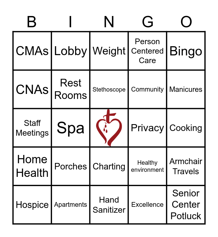 This bingo card has a free space and 74 words: Housekeeping, Dining Room, Stethoscope, Respect, Exercise, Nursing, Library, Meds, Dignity, Puzzles, Hospice, Movie Room, Community, Bingo, Maintenance, Apartments, Blood Pressure, Privacy, Crafts, CMAs, Spa, Weight, Person Centered Care, Cooking, CNAs, Beauty Shop, Med Cart, Responsibility, Resident Council Meetings, Administration, Rest Rooms, Care Plan, Independence, Trip to Walmart, Admissions, Soda Shop, Monthly Drills, Make choices, Senior Center Potluck, Dietary, Entry way, Charting, Self Care, Out to eat, Activities, Lobby, Pharmacy, Individuality, Religious Services, Therapy, Reception Desk, Masks, Healthy environment, Movies, Transportation, Laundry Rooms, Hand Sanitizer, Voice Grievances, Birthday Parties, Home Health, Porches, ADLs, Excellence, Armchair Travels, Staff Meetings, Activity Room, Dr.'s Orders, Integrity, Manicures, Grounds, Kitchen, Scrubs, Spirituality and Activity Store.