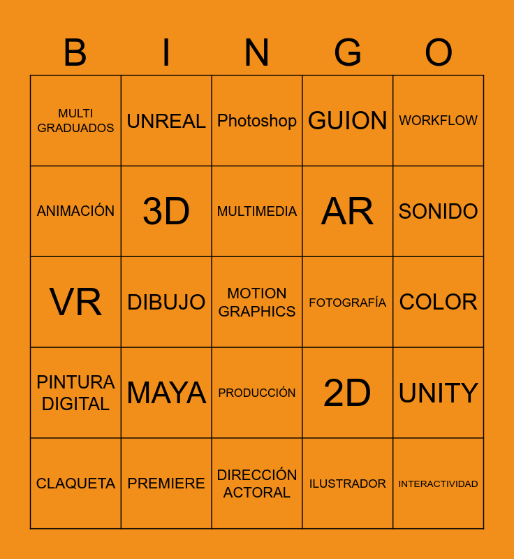 This bingo card has a free space and 24 words: MAYA, PREMIERE, MULTIMEDIA, CLAQUETA, WORKFLOW, MULTI GRADUADOS, ANIMACIÓN, UNREAL, FOTOGRAFÍA, PRODUCCIÓN, AR, VR, 2D, UNITY, 3D, ILUSTRADOR, COLOR, Photoshop, SONIDO, DIBUJO, INTERACTIVIDAD, PINTURA DIGITAL, GUION and DIRECCIÓN ACTORAL.