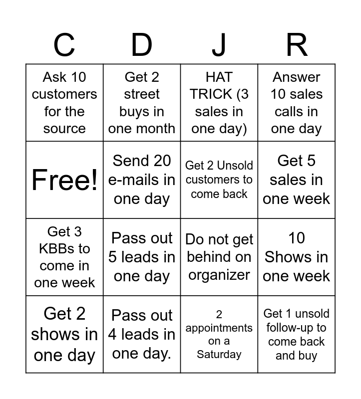 This bingo card has 16 words: Pass out 4 leads in one day., 10 Shows in one week, HAT TRICK (3 sales in one day), Ask 10 customers for the source, Get 3 KBBs to come in one week, Get 2 street buys in one month, Do not get behind on organizer, 2 appointments on a Saturday, Free!, Send 20 e-mails in one day, Get 2 shows in one day, Answer 10 sales calls in one day, Pass out 5 leads in one day, Get 5 sales in one week, Get 2 Unsold customers to come back and Get 1 unsold follow-up to come back and buy.