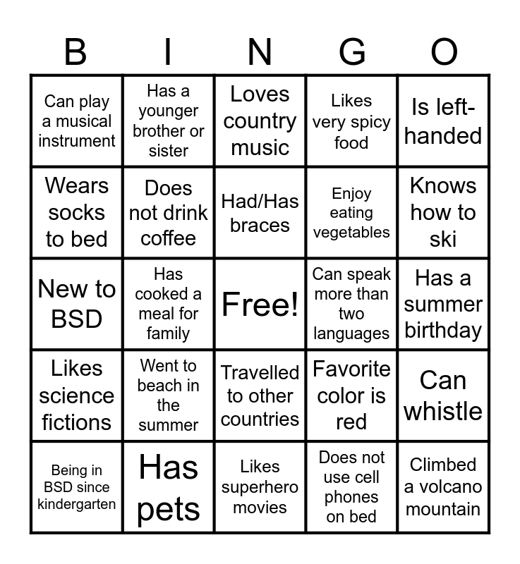 This bingo card has a free space and 24 words: Went to beach in the summer, Has pets, Had/Has braces, Being in BSD since kindergarten, Is left-handed, Can play a musical instrument, Wears socks to bed, Has a younger brother or sister, Can speak more than two languages, Travelled to other countries, Enjoy eating vegetables, New to BSD, Favorite color is red, Can whistle, Does not drink coffee, Does not use cell phones on bed, Has a summer birthday, Loves country music, Knows how to ski, Has cooked a meal for family, Climbed a volcano mountain, Likes science fictions, Likes very spicy food and Likes superhero movies.