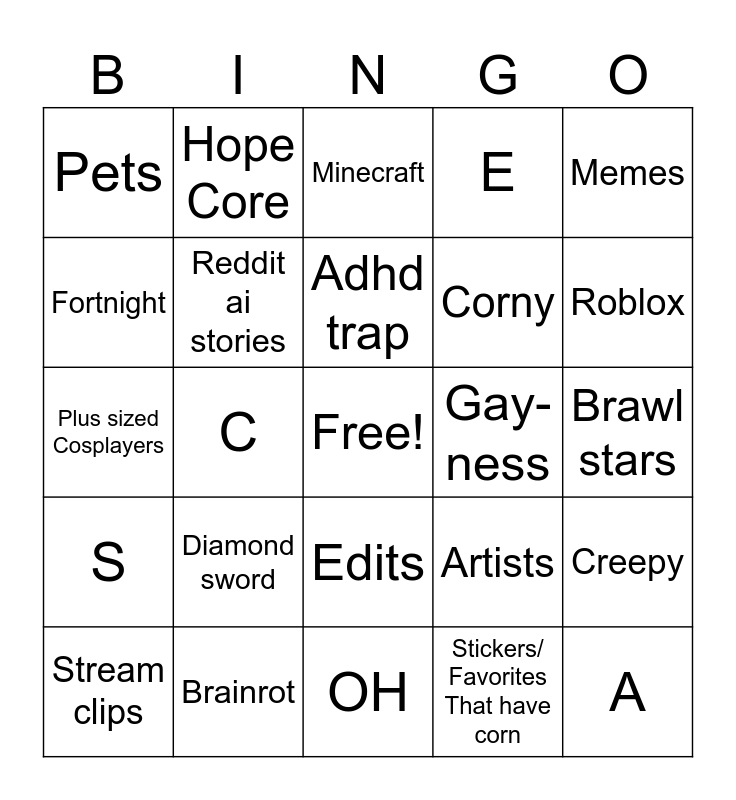 This bingo card has a free space and 24 words: Diamond sword, Brainrot, Adhd trap, Stream clips, Memes, Pets, Fortnight, Hope Core, Gay-ness, Edits, Corny, Plus sized Cosplayers, Artists, Creepy, Reddit ai stories, Stickers/ Favorites That have corn, Brawl stars, Minecraft, Roblox, C, A, S, E and OH.