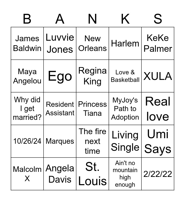 This bingo card has a free space and 24 words: Marques, Angela Davis, Regina King, Malcolm X, KeKe Palmer, James Baldwin, Maya Angelou, Luvvie Jones, MyJoy's Path to Adoption, The fire next time, Love & Basketball, Why did I get married?, Living Single, Umi Says, Ego, Ain't no mountain high enough, Real love, New Orleans, XULA, Resident Assistant, 2/22/22, 10/26/24, Harlem and St. Louis.