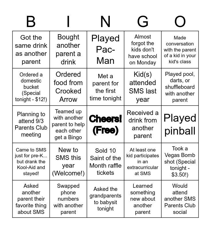 This bingo card has a free space and 24 words: New to SMS this year (Welcome!), Swapped phone numbers with another parent, Met a parent for the first time tonight, Asked another parent their favorite thing about SMS, Made conversation with the parent of a kid in your kid's class, Got the same drink as another parent, Ordered a domestic bucket (Special tonight - $12!), Bought another parent a drink, Received a drink from another parent, Sold 10 Saint of the Month raffle tickets, Kid(s) attended SMS last year, Planning to attend 9/3 Parents Club meeting, At least one kid participates in an extracurricular at SMS, Took a Vegas Bomb shot (Special tonight - $3.50!), Ordered food from Crooked Arrow, Learned something new about another parent, Played pinball, Played Pac-Man, Played pool, darts, or shuffleboard with another parent, Teamed up with another parent to help each other get a Bingo, Would attend another SMS Parents Club social, Came to SMS just for pre-K... but drank the Kool-Aid and stayed!, Almost forgot the kids don't have school on Monday and Asked the grandparents to babysit tonight.