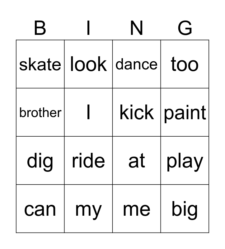 This bingo card has 16 words: my, play, dance, skate, dig, look, at, me, brother, I, can, too, ride, paint, kick and big.