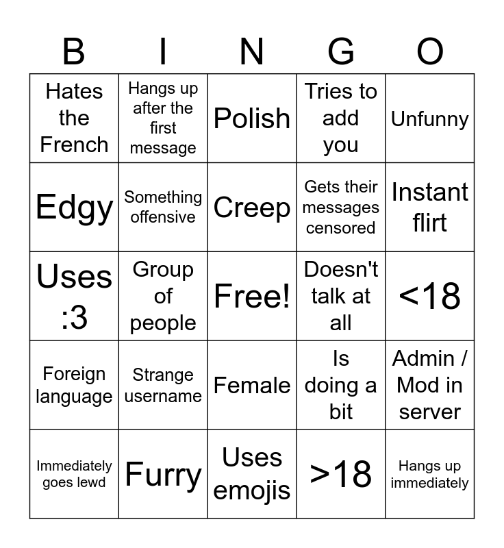 This bingo card has a free space and 24 words: Strange username, Furry, Creep, Immediately goes lewd, Unfunny, Hates the French, Edgy, Hangs up after the first message, Doesn't talk at all, Female, Gets their messages censored, Uses :3, Is doing a bit, Admin / Mod in server, Something offensive, >18, <18, Polish, Instant flirt, Group of people, Hangs up immediately, Foreign language, Tries to add you and Uses emojis.