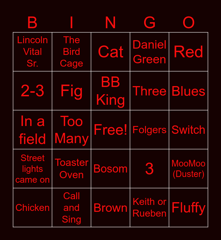This bingo card has a free space and 24 words: Chicken, Toaster Oven, BB King, Keith or Rueben, Red, Lincoln Vital Sr., The Bird Cage, Cat, Folgers, Switch, In a field, Fig, 3, MooMoo (Duster), 2-3, Call and Sing, Brown, Daniel Green, Blues, Street lights came on, Too Many, Bosom, Three and Fluffy.