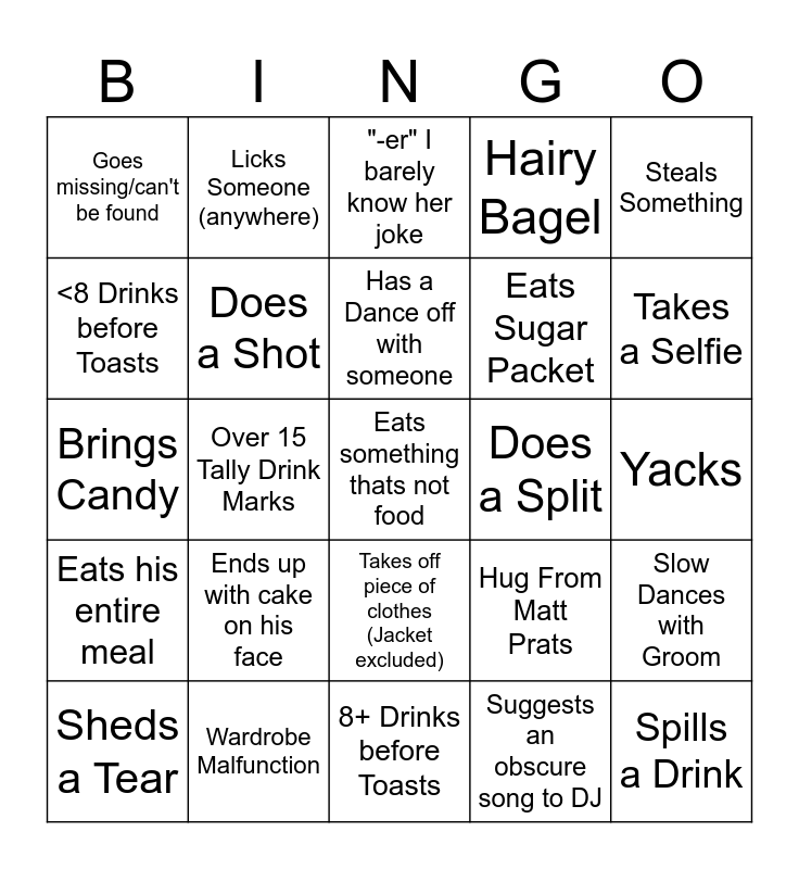 This bingo card has a free space and 27 words: Hug From Matt Prats, Does a Cartwheel, Eats Sugar Packet, 8+ Drinks before Toasts, <8 Drinks before Toasts, "-er" I barely know her joke, Licks Someone (anywhere), Eats his entire meal, Does a Split, Slow Dances with Groom, Brings Candy, Hairy Bagel, Sheds a Tear, Wardrobe Malfunction, Takes a Selfie, Gives a Toast, Does a Shot, Has a Dance off with someone, Ends up with cake on his face, Goes missing/can't be found, Yacks, Suggests an obscure song to DJ, Over 15 Tally Drink Marks, Spills a Drink, Takes off piece of clothes (Jacket excluded), Steals Something and Does the Worm.