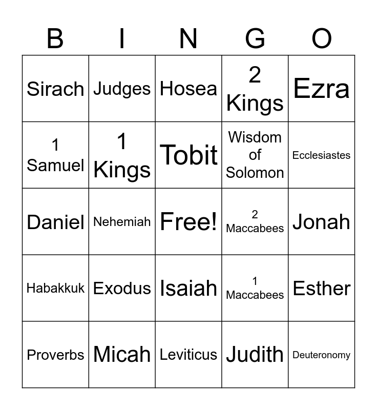 This bingo card has a free space and 47 words: Genesis, Deuteronomy, Numbers, Leviticus, Exodus, Joshua, Judges, Ruth, 1 Samuel, 2 Samuel, 1 Kings, 2 Kings, Esther, 1 Maccabees, 1 Chronicles, 2 Chronicles, Tobit, 2 Maccabees, Job, Ezra, Nehemiah, Judith, Sirach, Wisdom of Solomon, Song of Songs, Ecclesiastes, Proverbs, Psalms, Isaiah, Habakkuk, Zephaniah, Haggai, Zechariah, Malachi, Nahum, Micah, Jonah, Obadiah, Amos, Amos, Joel, Hosea, Daniel, Ezekiel, Baruch, Lamentations and Jeremiah.