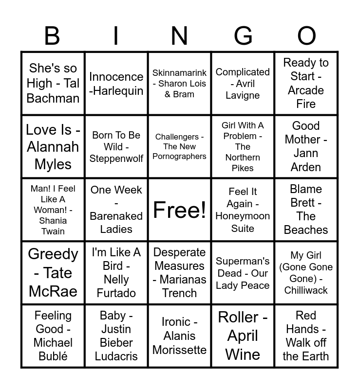 This bingo card has a free space and 79 words: Closer - Tegan and Sara, Help I'm Alive - Metric, Skinnamarink - Sharon Lois & Bram, Summer Of ‘69 - Bryan Adams, Ghosts 'n' Stuff - Deadmau5, Sundown - Gordon Lightfoot, Takin' Care Of Business - Bachman-Turner Overdrive, The Spirit Of Radio - Rush, My Heart Will Go On - Céline Dion, The Safety Dance - Men Without Hats, God's Plan - Drake, Lover's In A Dangerous Time - Bruce Cockburn, Complicated - Avril Lavigne, She's so High - Tal Bachman, Lay It on the Line - Triumph, Love Is - Alannah Myles, Working for the Weekend - Loverboy, I'm Like A Bird - Nelly Furtado, When She Loved Me - Sarah McLachlan, Blame Brett - The Beaches, Patio Lanterns - Kim Mitchell, Ready to Start - Arcade Fire, Man! I Feel Like A Woman! - Shania Twain, Challengers - The New Pornographers, Born To Be Wild - Steppenwolf, Sweet City Woman - Stampeders, Bobcaygeon - The Tragically Hip, Pinball King - Terra Lightfoot, Tongue Tied - Faber Drive, Big Yellow Taxi - Joni Mitchell, Good Mother - Jann Arden, Hayloft - Mother Mother, Ironic - Alanis Morissette, Riot - Three Days Grace, Feeling Good - Michael Bublé, Feel It Again - Honeymoon Suite, Take Me Away - Fefe Dobson, Leather Jacket - Arkells, In Too Deep - Sum 41, Red Hands - Walk off the Earth, Eyes Of A Stranger - The Payolas, We're Here For A Good Time - Trooper, The Rest of My Life - Sloan, Ordinary Day - Great Big Sea, Your Daddy Don't Know - Toronto, Innocence -Harlequin, Grow Up - Simple Plan, Body - Loud Luxury Brando, Paralyzer - Finger Eleven, Sucks To Be You - Prozzak, My Girl (Gone Gone Gone) - Chilliwack, One Week - Barenaked Ladies, Superman's Dead - Our Lady Peace, I Go Blind - 54-40, Push - Moist, Hasn't Hit Me Yet - Blue Rodeo, Can't Feel My Face - The Weeknd, Rockin' in the Free World - Neil Young, Tired of Waiting - The Trews, Desperate Measures - Marianas Trench, Girl With A Problem - The Northern Pikes, How You Remind Me - Nickleback, I'm An Adult Now - The Pursuit Of Happiness, Informer - Snow, Hallelujah - Leonard Cohen, The Hockey Song - Stompin' Tom Connors, Stitches - Shawn Mendes, Drinking in L.A - Bran Van 3000, Call Me Maybe - Carly Rae Jepsen, Greedy - Tate McRae, Baby - Justin Bieber Ludacris, Sunglasses at Night - Corey Hart, 1234 - Feist, American Woman - The Guess Who, Making It Work - Doug and the Slugs, Roller - April Wine, Cha-Ching - Hedley, S.O.S. (Sawed Off Shotgun) - The Glorious Sons and Whoa Is Me - Down With Webster.