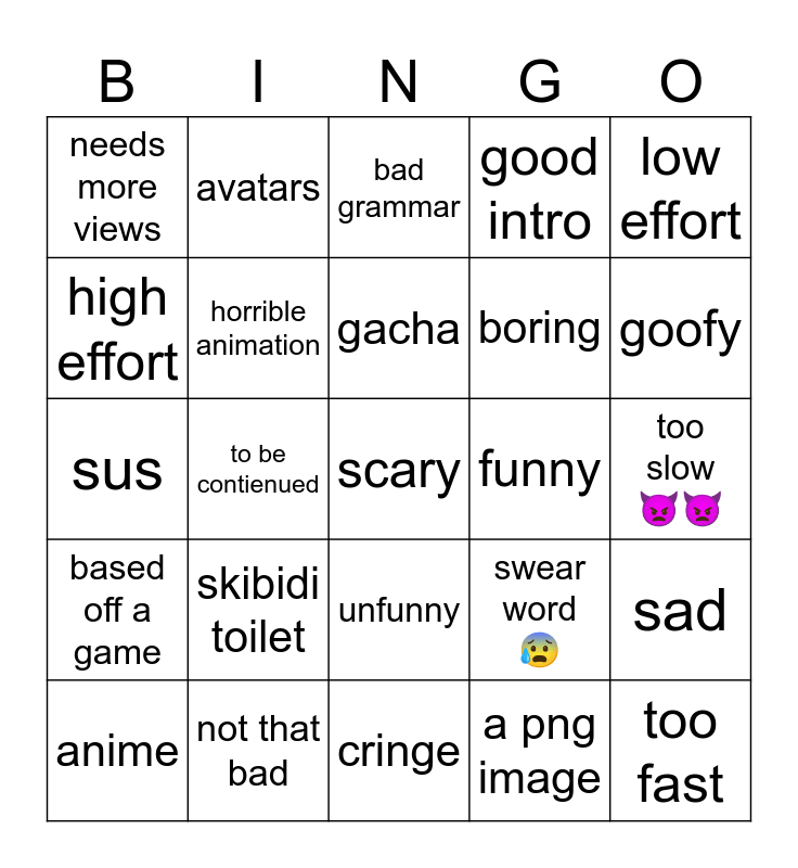 This bingo card has 25 words: skibidi toilet, cringe, gacha, anime, low effort, needs more views, high effort, avatars, funny, unfunny, boring, sus, swear word 😰, sad, horrible animation, too fast, too slow 👿👿, bad grammar, goofy, to be contienued, scary, not that bad, based off a game, good intro and a png image.