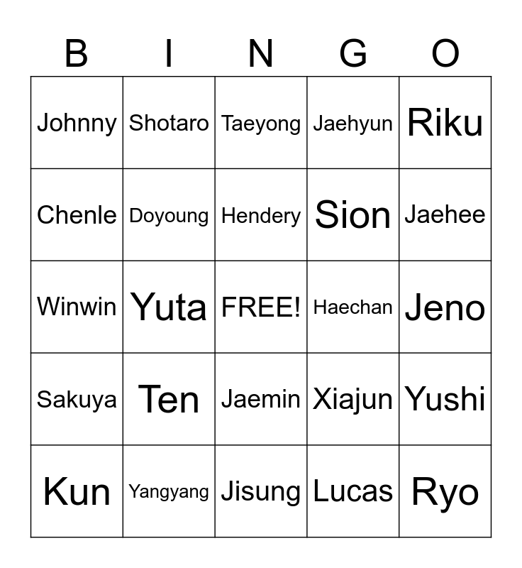 This bingo card has a free space and 29 words: Kun, Taeil, Yuta, Renjun, Johnny, Taeyong, Doyoung, Ten, Haechan, Yangyang, Jeno, Ryo, Jisung, Lucas, Jaehee, Mark, Jaemin, Sakuya, Riku, Winwin, Xiajun, Sungchan, Sion, Chenle, Jaehyun, Shotaro, Yushi, Hendery and Jungwoo.