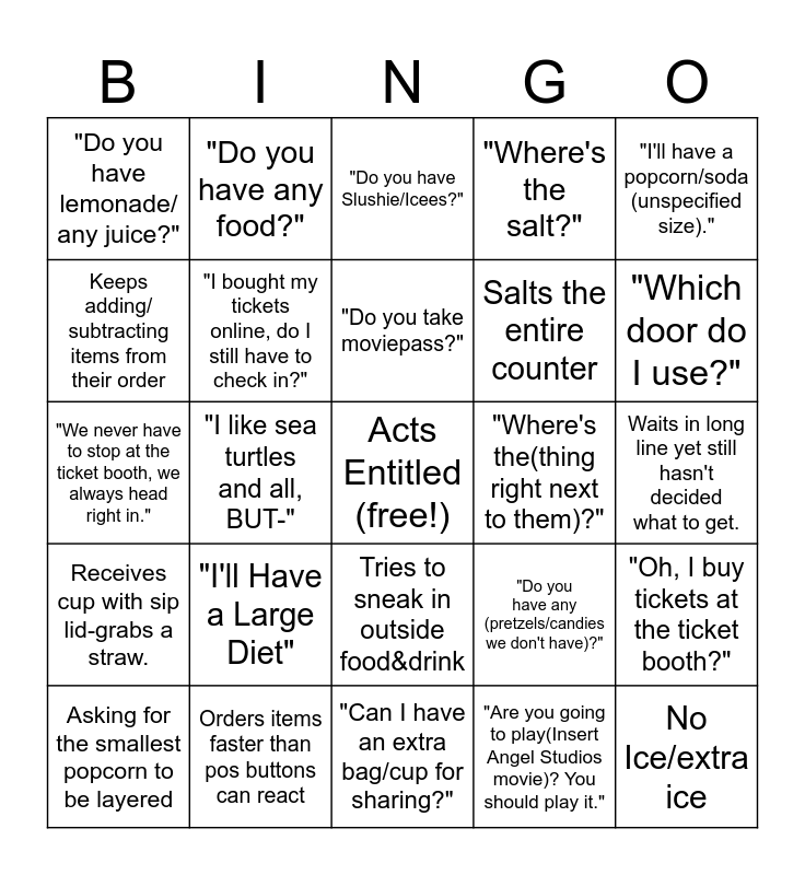 This bingo card has a free space and 24 words: Asking for the smallest popcorn to be layered, "I'll Have a Large Diet", "Do you take moviepass?", "Are you going to play(Insert Angel Studios movie)? You should play it.", "I'll have a popcorn/soda (unspecified size).", "Do you have lemonade/ any juice?", "Do you have any food?", "Do you have Slushie/Icees?", "Where's the(thing right next to them)?", Waits in long line yet still hasn't decided what to get., "We never have to stop at the ticket booth, we always head right in.", "I bought my tickets online, do I still have to check in?", "Do you have any (pretzels/candies we don't have)?", "Oh, I buy tickets at the ticket booth?", Keeps adding/ subtracting items from their order, Orders items faster than pos buttons can react, "Can I have an extra bag/cup for sharing?", "Where's the salt?", "Which door do I use?", Receives cup with sip lid-grabs a straw., "I like sea turtles and all, BUT-", Tries to sneak in outside food&drink, Salts the entire counter and No Ice/extra ice.