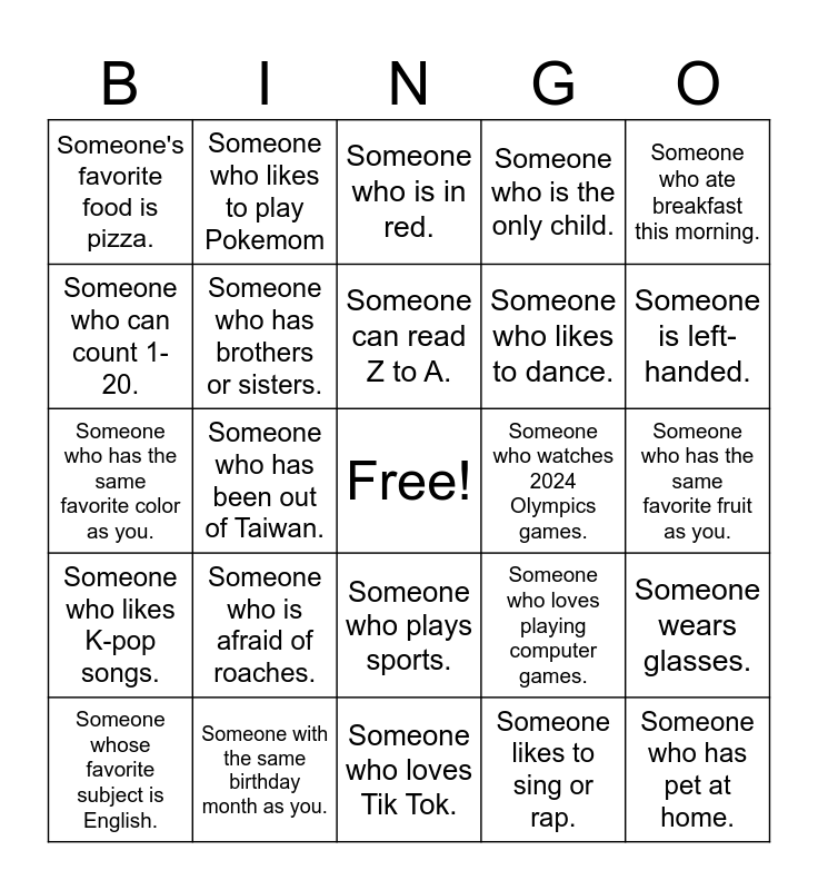 This bingo card has a free space and 24 words: Someone who is afraid of roaches., Someone with the same birthday month as you., Someone can read Z to A., Someone whose favorite subject is English., Someone who ate breakfast this morning., Someone's favorite food is pizza., Someone who can count 1- 20., Someone who likes to play Pokemom, Someone who watches 2024 Olympics games., Someone who plays sports., Someone who likes to dance., Someone who has the same favorite color as you., Someone who loves playing computer games., Someone wears glasses., Someone who has brothers or sisters., Someone likes to sing or rap., Someone who has the same favorite fruit as you., Someone who is in red., Someone is left- handed., Someone who has been out of Taiwan., Someone who has pet at home., Someone who likes K-pop songs., Someone who is the only child. and Someone who loves Tik Tok..