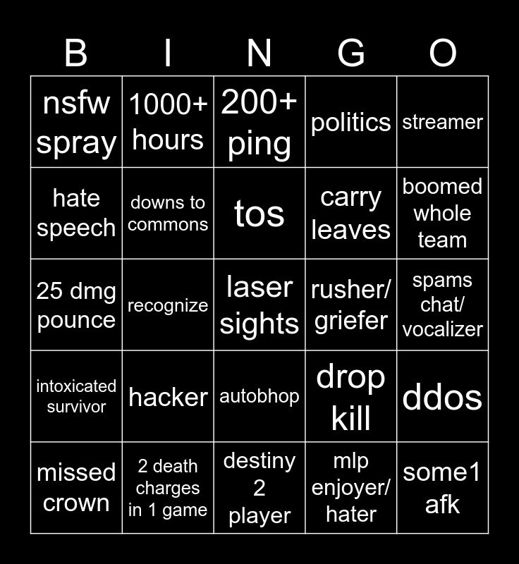 This bingo card has a free space and 24 words: hacker, 2 death charges in 1 game, tos, missed crown, streamer, nsfw spray, hate speech, 1000+ hours, rusher/ griefer, autobhop, carry leaves, 25 dmg pounce, drop kill, ddos, downs to commons, mlp enjoyer/ hater, spams chat/ vocalizer, 200+ ping, boomed whole team, recognize, some1 afk, intoxicated survivor, politics and destiny 2 player.
