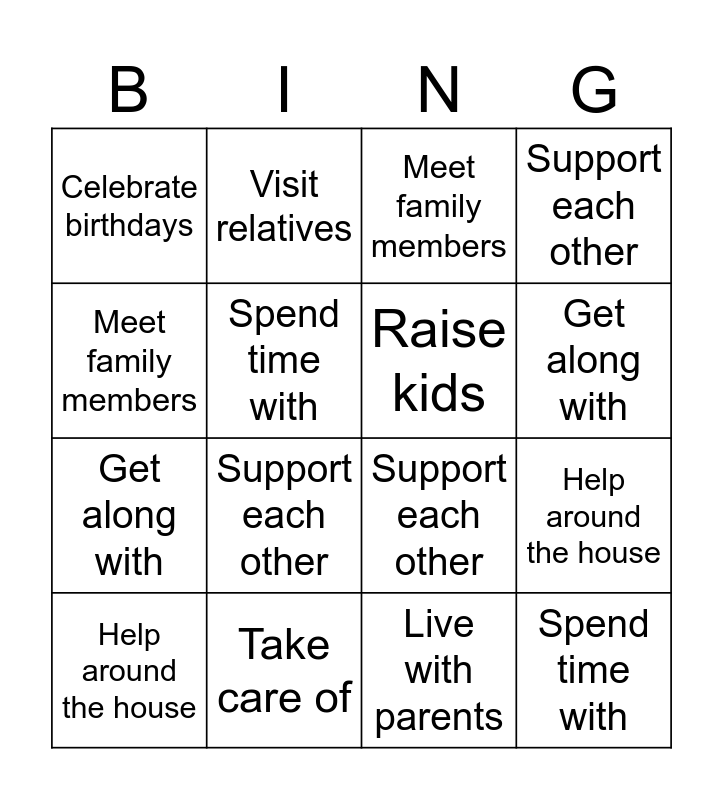 This bingo card has 19 words: Support each other, Help around the house, Meet family members, Spend time with, Help around the house, Meet family members, Live with parents, Celebrate birthdays, Visit relatives, Get along with, Support each other, Spend time with, Raise kids, Take care of, Help around the house, Live with parents, Support each other, Get along with and Meet family members.