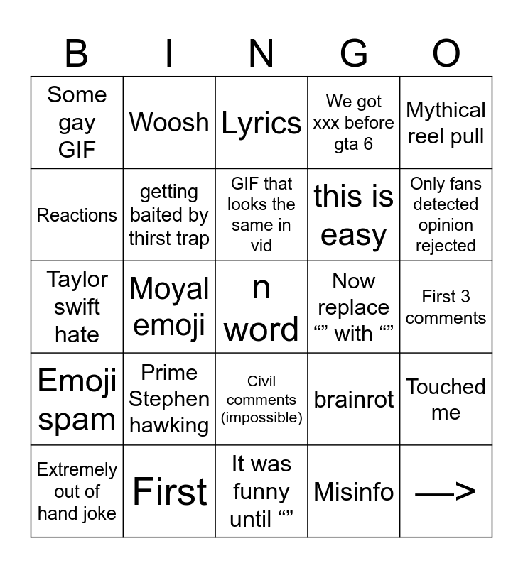 This bingo card has a free space and 24 words: Extremely out of hand joke, Prime Stephen hawking, GIF that looks the same in vid, Misinfo, Mythical reel pull, Some gay GIF, Woosh, Lyrics, Now replace “” with “”, First 3 comments, Taylor swift hate, getting baited by thirst trap, brainrot, Touched me, Reactions, First, It was funny until “”, We got xxx before gta 6, Only fans detected opinion rejected, Emoji spam, Moyal emoji, Civil comments (impossible), this is easy and —>.
