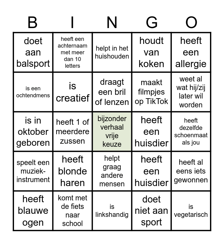 This bingo card has a free space and 24 words: heeft blonde haren, komt met de fiets naar school, draagt een bril of lenzen, heeft blauwe ogen, heeft een allergie, doet aan balsport, is een ochtendmens, heeft een achternaam met meer dan 10 letters, heeft een huisdier, helpt graag andere mensen, maakt filmpjes op TikTok, is in oktober geboren, heeft een huisdier, heeft al eens iets gewonnen, is creatief, doet niet aan sport, heeft dezelfde schoenmaat als jou, helpt in het huishouden, weet al wat hij/zij later wil worden, heeft 1 of meerdere zussen, is vegetarisch, speelt een muziek-instrument, houdt van koken and is linkshandig.