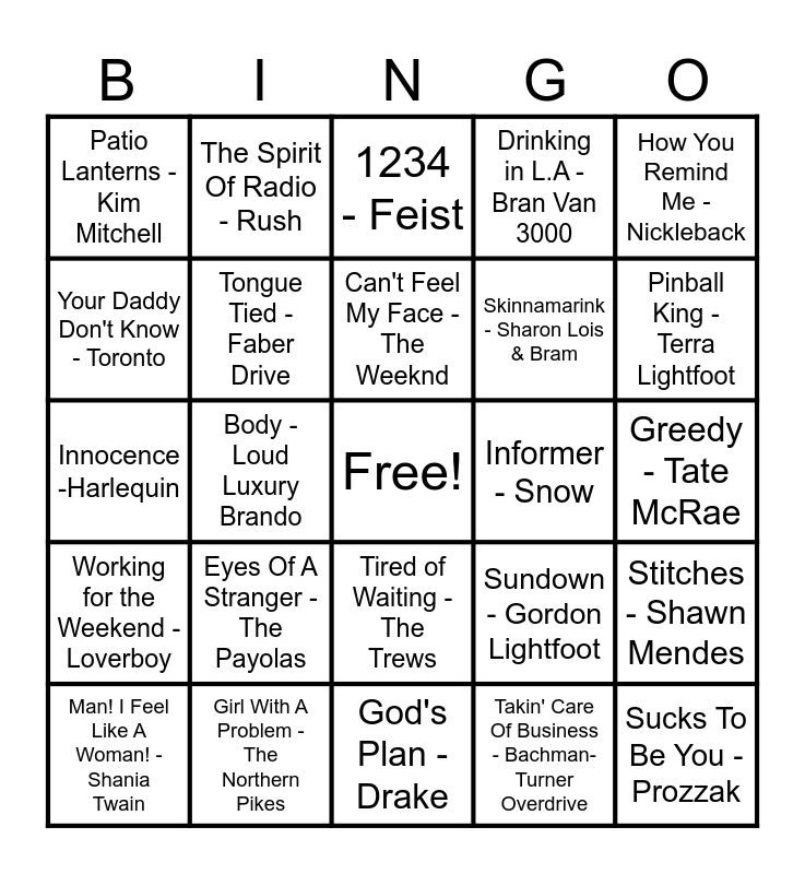 This bingo card has a free space and 79 words: Paralyzer - Finger Eleven, The Hockey Song - Stompin' Tom Connors, 1234 - Feist, Hayloft - Mother Mother, Roller - April Wine, Blame Brett - The Beaches, In Too Deep - Sum 41, Ghosts 'n' Stuff - Deadmau5, She's so High - Tal Bachman, Sweet City Woman - Stampeders, Sunglasses at Night - Corey Hart, Push - Moist, Drinking in L.A - Bran Van 3000, Patio Lanterns - Kim Mitchell, I'm An Adult Now - The Pursuit Of Happiness, Your Daddy Don't Know - Toronto, Take Me Away - Fefe Dobson, Eyes Of A Stranger - The Payolas, Closer - Tegan and Sara, Greedy - Tate McRae, Cha-Ching - Hedley, How You Remind Me - Nickleback, Innocence -Harlequin, Can't Feel My Face - The Weeknd, Tongue Tied - Faber Drive, Love Is - Alannah Myles, Red Hands - Walk off the Earth, One Week - Barenaked Ladies, Riot - Three Days Grace, Challengers - The New Pornographers, Pinball King - Terra Lightfoot, Hasn't Hit Me Yet - Blue Rodeo, God's Plan - Drake, Call Me Maybe - Carly Rae Jepsen, Man! I Feel Like A Woman! - Shania Twain, Informer - Snow, Born To Be Wild - Steppenwolf, S.O.S. (Sawed Off Shotgun) - The Glorious Sons, I Go Blind - 54-40, Sucks To Be You - Prozzak, Desperate Measures - Marianas Trench, Superman's Dead - Our Lady Peace, Baby - Justin Bieber Ludacris, When She Loved Me - Sarah McLachlan, The Rest of My Life - Sloan, The Spirit Of Radio - Rush, Ready to Start - Arcade Fire, Summer Of ‘69 - Bryan Adams, We're Here For A Good Time - Trooper, Big Yellow Taxi - Joni Mitchell, Stitches - Shawn Mendes, Body - Loud Luxury Brando, Sundown - Gordon Lightfoot, Bobcaygeon - The Tragically Hip, Making It Work - Doug and the Slugs, Good Mother - Jann Arden, Help I'm Alive - Metric, Complicated - Avril Lavigne, Ironic - Alanis Morissette, Tired of Waiting - The Trews, Skinnamarink - Sharon Lois & Bram, Rockin' in the Free World - Neil Young, Ordinary Day - Great Big Sea, Feeling Good - Michael Bublé, My Heart Will Go On - Céline Dion, Lay It on the Line - Triumph, Feel It Again - Honeymoon Suite, Leather Jacket - Arkells, Whoa Is Me - Down With Webster, Working for the Weekend - Loverboy, Girl With A Problem - The Northern Pikes, I'm Like A Bird - Nelly Furtado, Grow Up - Simple Plan, American Woman - The Guess Who, My Girl (Gone Gone Gone) - Chilliwack, Takin' Care Of Business - Bachman-Turner Overdrive, Hallelujah - Leonard Cohen, The Safety Dance - Men Without Hats and Lover's In A Dangerous Time - Bruce Cockburn.