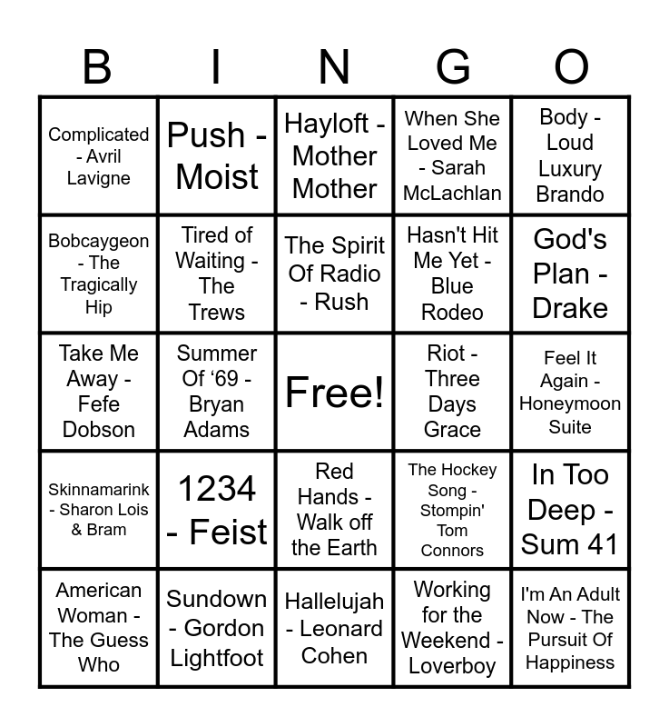 This bingo card has a free space and 79 words: Baby - Justin Bieber Ludacris, One Week - Barenaked Ladies, Hayloft - Mother Mother, Whoa Is Me - Down With Webster, Innocence -Harlequin, Patio Lanterns - Kim Mitchell, The Safety Dance - Men Without Hats, S.O.S. (Sawed Off Shotgun) - The Glorious Sons, Man! I Feel Like A Woman! - Shania Twain, Good Mother - Jann Arden, Stitches - Shawn Mendes, Rockin' in the Free World - Neil Young, When She Loved Me - Sarah McLachlan, Complicated - Avril Lavigne, Girl With A Problem - The Northern Pikes, Bobcaygeon - The Tragically Hip, Help I'm Alive - Metric, 1234 - Feist, Call Me Maybe - Carly Rae Jepsen, Feel It Again - Honeymoon Suite, Pinball King - Terra Lightfoot, Body - Loud Luxury Brando, Take Me Away - Fefe Dobson, The Spirit Of Radio - Rush, Tired of Waiting - The Trews, Lay It on the Line - Triumph, Sucks To Be You - Prozzak, How You Remind Me - Nickleback, Can't Feel My Face - The Weeknd, Sunglasses at Night - Corey Hart, God's Plan - Drake, Feeling Good - Michael Bublé, Hallelujah - Leonard Cohen, Ready to Start - Arcade Fire, American Woman - The Guess Who, Riot - Three Days Grace, Informer - Snow, My Heart Will Go On - Céline Dion, Desperate Measures - Marianas Trench, I'm An Adult Now - The Pursuit Of Happiness, Grow Up - Simple Plan, Ironic - Alanis Morissette, The Rest of My Life - Sloan, I Go Blind - 54-40, Your Daddy Don't Know - Toronto, Push - Moist, Closer - Tegan and Sara, Blame Brett - The Beaches, Paralyzer - Finger Eleven, My Girl (Gone Gone Gone) - Chilliwack, In Too Deep - Sum 41, Summer Of ‘69 - Bryan Adams, The Hockey Song - Stompin' Tom Connors, Sweet City Woman - Stampeders, Takin' Care Of Business - Bachman-Turner Overdrive, Big Yellow Taxi - Joni Mitchell, Lover's In A Dangerous Time - Bruce Cockburn, Cha-Ching - Hedley, I'm Like A Bird - Nelly Furtado, Red Hands - Walk off the Earth, Hasn't Hit Me Yet - Blue Rodeo, Superman's Dead - Our Lady Peace, Roller - April Wine, She's so High - Tal Bachman, Tongue Tied - Faber Drive, Ordinary Day - Great Big Sea, Ghosts 'n' Stuff - Deadmau5, Drinking in L.A - Bran Van 3000, Love Is - Alannah Myles, Skinnamarink - Sharon Lois & Bram, Sundown - Gordon Lightfoot, Challengers - The New Pornographers, Leather Jacket - Arkells, We're Here For A Good Time - Trooper, Eyes Of A Stranger - The Payolas, Working for the Weekend - Loverboy, Making It Work - Doug and the Slugs, Greedy - Tate McRae and Born To Be Wild - Steppenwolf.