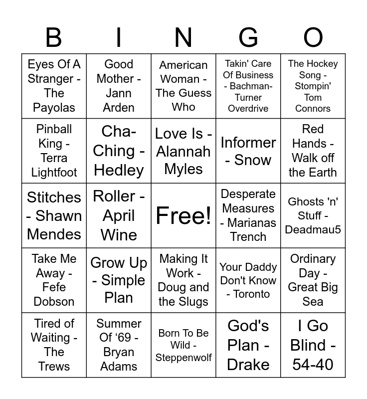This bingo card has a free space and 79 words: Sundown - Gordon Lightfoot, Sucks To Be You - Prozzak, American Woman - The Guess Who, I'm An Adult Now - The Pursuit Of Happiness, One Week - Barenaked Ladies, Working for the Weekend - Loverboy, Big Yellow Taxi - Joni Mitchell, How You Remind Me - Nickleback, Hasn't Hit Me Yet - Blue Rodeo, Greedy - Tate McRae, I'm Like A Bird - Nelly Furtado, Can't Feel My Face - The Weeknd, Takin' Care Of Business - Bachman-Turner Overdrive, Eyes Of A Stranger - The Payolas, Drinking in L.A - Bran Van 3000, Pinball King - Terra Lightfoot, Lover's In A Dangerous Time - Bruce Cockburn, Grow Up - Simple Plan, Baby - Justin Bieber Ludacris, Ghosts 'n' Stuff - Deadmau5, Girl With A Problem - The Northern Pikes, The Hockey Song - Stompin' Tom Connors, Stitches - Shawn Mendes, Love Is - Alannah Myles, Cha-Ching - Hedley, Body - Loud Luxury Brando, Paralyzer - Finger Eleven, The Safety Dance - Men Without Hats, Feel It Again - Honeymoon Suite, Skinnamarink - Sharon Lois & Bram, Red Hands - Walk off the Earth, 1234 - Feist, Born To Be Wild - Steppenwolf, When She Loved Me - Sarah McLachlan, Tired of Waiting - The Trews, Desperate Measures - Marianas Trench, Blame Brett - The Beaches, Complicated - Avril Lavigne, Sunglasses at Night - Corey Hart, I Go Blind - 54-40, Bobcaygeon - The Tragically Hip, Push - Moist, Man! I Feel Like A Woman! - Shania Twain, The Spirit Of Radio - Rush, Rockin' in the Free World - Neil Young, Good Mother - Jann Arden, Leather Jacket - Arkells, She's so High - Tal Bachman, Help I'm Alive - Metric, Challengers - The New Pornographers, Ordinary Day - Great Big Sea, Roller - April Wine, Your Daddy Don't Know - Toronto, Ironic - Alanis Morissette, My Heart Will Go On - Céline Dion, Hayloft - Mother Mother, Riot - Three Days Grace, The Rest of My Life - Sloan, Lay It on the Line - Triumph, Making It Work - Doug and the Slugs, Informer - Snow, In Too Deep - Sum 41, Sweet City Woman - Stampeders, Superman's Dead - Our Lady Peace, Whoa Is Me - Down With Webster, Innocence -Harlequin, Call Me Maybe - Carly Rae Jepsen, Tongue Tied - Faber Drive, Hallelujah - Leonard Cohen, Take Me Away - Fefe Dobson, Summer Of ‘69 - Bryan Adams, We're Here For A Good Time - Trooper, Closer - Tegan and Sara, Feeling Good - Michael Bublé, Patio Lanterns - Kim Mitchell, God's Plan - Drake, Ready to Start - Arcade Fire, S.O.S. (Sawed Off Shotgun) - The Glorious Sons and My Girl (Gone Gone Gone) - Chilliwack.