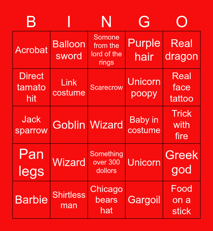 This bingo card has 27 words: Barbie, Shirtless man, Scarecrow, Gargoil, Real face tattoo, Acrobat, Balloon sword, Something over 300 dollors, Unicorn poopy, Food on a stick, Jack sparrow, Link costume, Chicago bears hat, Unicorn, Trick with fire, Somone being excorted, Goblin, Somone from the lord of the rings, Baby in costume, Real dragon, Pan legs, Wizard, Wizard, Purple hair, Greek god, Direct tamato hit and Bag pipes.