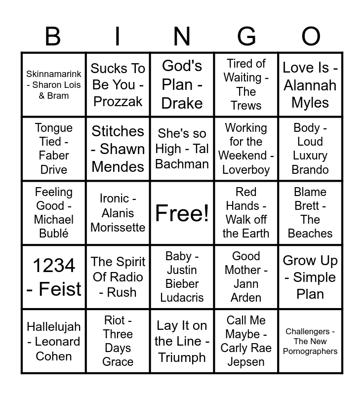 This bingo card has a free space and 79 words: Feel It Again - Honeymoon Suite, I Go Blind - 54-40, God's Plan - Drake, Leather Jacket - Arkells, We're Here For A Good Time - Trooper, Cha-Ching - Hedley, Bobcaygeon - The Tragically Hip, Roller - April Wine, Your Daddy Don't Know - Toronto, Girl With A Problem - The Northern Pikes, Ready to Start - Arcade Fire, Making It Work - Doug and the Slugs, Tired of Waiting - The Trews, Skinnamarink - Sharon Lois & Bram, Lover's In A Dangerous Time - Bruce Cockburn, Tongue Tied - Faber Drive, Sundown - Gordon Lightfoot, The Spirit Of Radio - Rush, Sweet City Woman - Stampeders, Blame Brett - The Beaches, Informer - Snow, Love Is - Alannah Myles, Feeling Good - Michael Bublé, She's so High - Tal Bachman, Stitches - Shawn Mendes, One Week - Barenaked Ladies, Summer Of ‘69 - Bryan Adams, Drinking in L.A - Bran Van 3000, Push - Moist, I'm Like A Bird - Nelly Furtado, Body - Loud Luxury Brando, Whoa Is Me - Down With Webster, Lay It on the Line - Triumph, Sunglasses at Night - Corey Hart, Hallelujah - Leonard Cohen, Red Hands - Walk off the Earth, My Heart Will Go On - Céline Dion, Man! I Feel Like A Woman! - Shania Twain, Eyes Of A Stranger - The Payolas, Challengers - The New Pornographers, Paralyzer - Finger Eleven, Help I'm Alive - Metric, Ghosts 'n' Stuff - Deadmau5, The Rest of My Life - Sloan, I'm An Adult Now - The Pursuit Of Happiness, Sucks To Be You - Prozzak, Hayloft - Mother Mother, The Safety Dance - Men Without Hats, Big Yellow Taxi - Joni Mitchell, Take Me Away - Fefe Dobson, Grow Up - Simple Plan, Ironic - Alanis Morissette, Good Mother - Jann Arden, S.O.S. (Sawed Off Shotgun) - The Glorious Sons, Pinball King - Terra Lightfoot, Takin' Care Of Business - Bachman-Turner Overdrive, How You Remind Me - Nickleback, Patio Lanterns - Kim Mitchell, Born To Be Wild - Steppenwolf, Baby - Justin Bieber Ludacris, Working for the Weekend - Loverboy, Can't Feel My Face - The Weeknd, Closer - Tegan and Sara, Superman's Dead - Our Lady Peace, Rockin' in the Free World - Neil Young, The Hockey Song - Stompin' Tom Connors, Desperate Measures - Marianas Trench, Greedy - Tate McRae, In Too Deep - Sum 41, 1234 - Feist, Riot - Three Days Grace, Complicated - Avril Lavigne, When She Loved Me - Sarah McLachlan, My Girl (Gone Gone Gone) - Chilliwack, Ordinary Day - Great Big Sea, Call Me Maybe - Carly Rae Jepsen, Hasn't Hit Me Yet - Blue Rodeo, Innocence - Harlequin and American Woman - The Guess Who.