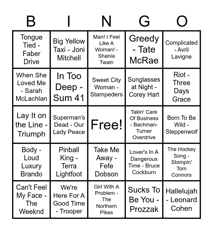This bingo card has a free space and 79 words: Cha-Ching - Hedley, Eyes Of A Stranger - The Payolas, Man! I Feel Like A Woman! - Shania Twain, American Woman - The Guess Who, Closer - Tegan and Sara, Love Is - Alannah Myles, My Girl (Gone Gone Gone) - Chilliwack, Push - Moist, Your Daddy Don't Know - Toronto, I'm Like A Bird - Nelly Furtado, Sundown - Gordon Lightfoot, Leather Jacket - Arkells, Greedy - Tate McRae, Tongue Tied - Faber Drive, Red Hands - Walk off the Earth, When She Loved Me - Sarah McLachlan, Tired of Waiting - The Trews, Pinball King - Terra Lightfoot, How You Remind Me - Nickleback, Born To Be Wild - Steppenwolf, Patio Lanterns - Kim Mitchell, Complicated - Avril Lavigne, Lay It on the Line - Triumph, Sweet City Woman - Stampeders, In Too Deep - Sum 41, Ordinary Day - Great Big Sea, Skinnamarink - Sharon Lois & Bram, Help I'm Alive - Metric, Feeling Good - Michael Bublé, Stitches - Shawn Mendes, Riot - Three Days Grace, Challengers - The New Pornographers, Girl With A Problem - The Northern Pikes, Desperate Measures - Marianas Trench, Can't Feel My Face - The Weeknd, Takin' Care Of Business - Bachman-Turner Overdrive, S.O.S. (Sawed Off Shotgun) - The Glorious Sons, Roller - April Wine, Hasn't Hit Me Yet - Blue Rodeo, Hallelujah - Leonard Cohen, Blame Brett - The Beaches, My Heart Will Go On - Céline Dion, Drinking in L.A - Bran Van 3000, Paralyzer - Finger Eleven, Baby - Justin Bieber Ludacris, Big Yellow Taxi - Joni Mitchell, Informer - Snow, The Safety Dance - Men Without Hats, The Spirit Of Radio - Rush, Hayloft - Mother Mother, The Hockey Song - Stompin' Tom Connors, Superman's Dead - Our Lady Peace, Lover's In A Dangerous Time - Bruce Cockburn, Grow Up - Simple Plan, Rockin' in the Free World - Neil Young, Feel It Again - Honeymoon Suite, Whoa Is Me - Down With Webster, Summer Of ‘69 - Bryan Adams, Making It Work - Doug and the Slugs, Take Me Away - Fefe Dobson, Sunglasses at Night - Corey Hart, Bobcaygeon - The Tragically Hip, Ironic - Alanis Morissette, Innocence - Harlequin, 1234 - Feist, The Rest of My Life - Sloan, One Week - Barenaked Ladies, I Go Blind - 54-40, Call Me Maybe - Carly Rae Jepsen, Body - Loud Luxury Brando, We're Here For A Good Time - Trooper, Ghosts 'n' Stuff - Deadmau5, I'm An Adult Now - The Pursuit Of Happiness, She's so High - Tal Bachman, Ready to Start - Arcade Fire, Sucks To Be You - Prozzak, Good Mother - Jann Arden, Working for the Weekend - Loverboy and God's Plan - Drake.