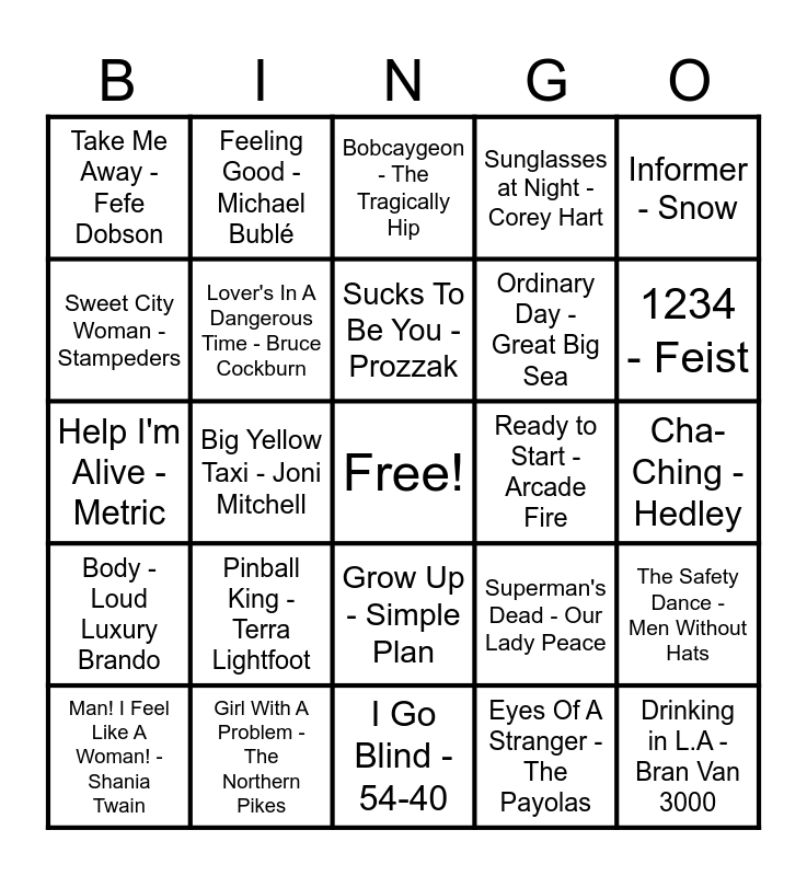 This bingo card has a free space and 79 words: Hasn't Hit Me Yet - Blue Rodeo, Skinnamarink - Sharon Lois & Bram, Bobcaygeon - The Tragically Hip, Leather Jacket - Arkells, Call Me Maybe - Carly Rae Jepsen, She's so High - Tal Bachman, Paralyzer - Finger Eleven, Can't Feel My Face - The Weeknd, Push - Moist, Tired of Waiting - The Trews, Challengers - The New Pornographers, Blame Brett - The Beaches, Sunglasses at Night - Corey Hart, Take Me Away - Fefe Dobson, S.O.S. (Sawed Off Shotgun) - The Glorious Sons, Sweet City Woman - Stampeders, Greedy - Tate McRae, Pinball King - Terra Lightfoot, Born To Be Wild - Steppenwolf, Cha-Ching - Hedley, Desperate Measures - Marianas Trench, Informer - Snow, Help I'm Alive - Metric, Sucks To Be You - Prozzak, Lover's In A Dangerous Time - Bruce Cockburn, Ghosts 'n' Stuff - Deadmau5, I'm Like A Bird - Nelly Furtado, In Too Deep - Sum 41, My Heart Will Go On - Céline Dion, When She Loved Me - Sarah McLachlan, 1234 - Feist, Sundown - Gordon Lightfoot, I Go Blind - 54-40, Stitches - Shawn Mendes, Man! I Feel Like A Woman! - Shania Twain, Ready to Start - Arcade Fire, God's Plan - Drake, Baby - Justin Bieber Ludacris, One Week - Barenaked Ladies, Drinking in L.A - Bran Van 3000, How You Remind Me - Nickleback, We're Here For A Good Time - Trooper, Summer Of ‘69 - Bryan Adams, Hayloft - Mother Mother, I'm An Adult Now - The Pursuit Of Happiness, Feeling Good - Michael Bublé, Red Hands - Walk off the Earth, Complicated - Avril Lavigne, American Woman - The Guess Who, The Rest of My Life - Sloan, The Safety Dance - Men Without Hats, Big Yellow Taxi - Joni Mitchell, Superman's Dead - Our Lady Peace, Lay It on the Line - Triumph, Working for the Weekend - Loverboy, Ironic - Alanis Morissette, Hallelujah - Leonard Cohen, Roller - April Wine, Rockin' in the Free World - Neil Young, Grow Up - Simple Plan, Ordinary Day - Great Big Sea, My Girl (Gone Gone Gone) - Chilliwack, Takin' Care Of Business - Bachman-Turner Overdrive, The Hockey Song - Stompin' Tom Connors, Innocence - Harlequin, Riot - Three Days Grace, Making It Work - Doug and the Slugs, Good Mother - Jann Arden, Love Is - Alannah Myles, Body - Loud Luxury Brando, Girl With A Problem - The Northern Pikes, The Spirit Of Radio - Rush, Tongue Tied - Faber Drive, Whoa Is Me - Down With Webster, Your Daddy Don't Know - Toronto, Eyes Of A Stranger - The Payolas, Patio Lanterns - Kim Mitchell, Feel It Again - Honeymoon Suite and Closer - Tegan and Sara.