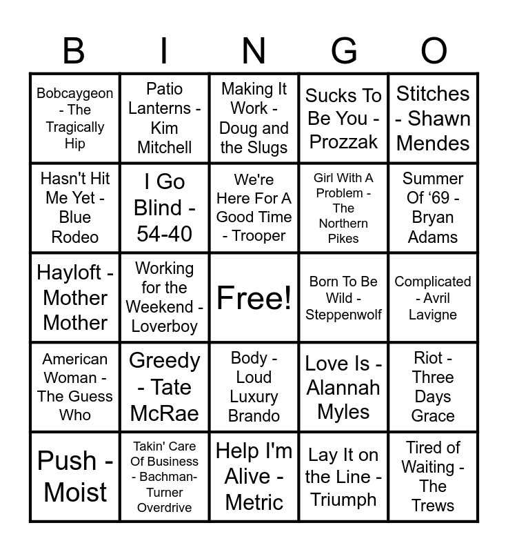 This bingo card has a free space and 79 words: Call Me Maybe - Carly Rae Jepsen, Ready to Start - Arcade Fire, Making It Work - Doug and the Slugs, Whoa Is Me - Down With Webster, Lover's In A Dangerous Time - Bruce Cockburn, Feel It Again - Honeymoon Suite, I'm An Adult Now - The Pursuit Of Happiness, Sundown - Gordon Lightfoot, The Rest of My Life - Sloan, I'm Like A Bird - Nelly Furtado, Roller - April Wine, Take Me Away - Fefe Dobson, Sucks To Be You - Prozzak, Bobcaygeon - The Tragically Hip, Tongue Tied - Faber Drive, Hasn't Hit Me Yet - Blue Rodeo, One Week - Barenaked Ladies, Greedy - Tate McRae, Blame Brett - The Beaches, Complicated - Avril Lavigne, Informer - Snow, Stitches - Shawn Mendes, Hayloft - Mother Mother, We're Here For A Good Time - Trooper, I Go Blind - 54-40, My Girl (Gone Gone Gone) - Chilliwack, The Hockey Song - Stompin' Tom Connors, The Safety Dance - Men Without Hats, Drinking in L.A - Bran Van 3000, My Heart Will Go On - Céline Dion, Summer Of ‘69 - Bryan Adams, Sunglasses at Night - Corey Hart, Help I'm Alive - Metric, Rockin' in the Free World - Neil Young, Push - Moist, Born To Be Wild - Steppenwolf, Sweet City Woman - Stampeders, In Too Deep - Sum 41, Grow Up - Simple Plan, Tired of Waiting - The Trews, Paralyzer - Finger Eleven, Baby - Justin Bieber Ludacris, S.O.S. (Sawed Off Shotgun) - The Glorious Sons, God's Plan - Drake, Superman's Dead - Our Lady Peace, Patio Lanterns - Kim Mitchell, Innocence - Harlequin, 1234 - Feist, Can't Feel My Face - The Weeknd, The Spirit Of Radio - Rush, Riot - Three Days Grace, Working for the Weekend - Loverboy, Love Is - Alannah Myles, Desperate Measures - Marianas Trench, When She Loved Me - Sarah McLachlan, Leather Jacket - Arkells, She's so High - Tal Bachman, Cha-Ching - Hedley, Pinball King - Terra Lightfoot, Body - Loud Luxury Brando, Girl With A Problem - The Northern Pikes, Feeling Good - Michael Bublé, Skinnamarink - Sharon Lois & Bram, Ironic - Alanis Morissette, Ordinary Day - Great Big Sea, Your Daddy Don't Know - Toronto, Ghosts 'n' Stuff - Deadmau5, Closer - Tegan and Sara, Eyes Of A Stranger - The Payolas, American Woman - The Guess Who, Takin' Care Of Business - Bachman-Turner Overdrive, How You Remind Me - Nickleback, Challengers - The New Pornographers, Red Hands - Walk off the Earth, Good Mother - Jann Arden, Lay It on the Line - Triumph, Big Yellow Taxi - Joni Mitchell, Hallelujah - Leonard Cohen and Man! I Feel Like A Woman! - Shania Twain.