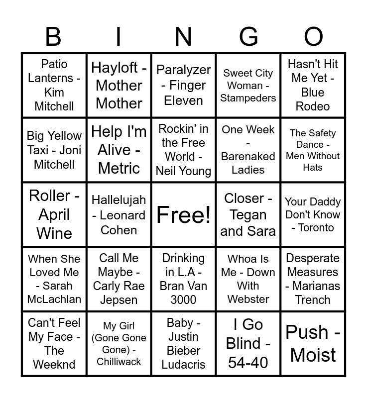 This bingo card has a free space and 79 words: Grow Up - Simple Plan, Cha-Ching - Hedley, Paralyzer - Finger Eleven, Sucks To Be You - Prozzak, She's so High - Tal Bachman, Lay It on the Line - Triumph, Stitches - Shawn Mendes, My Heart Will Go On - Céline Dion, Greedy - Tate McRae, Man! I Feel Like A Woman! - Shania Twain, Sundown - Gordon Lightfoot, Tired of Waiting - The Trews, Sweet City Woman - Stampeders, Patio Lanterns - Kim Mitchell, Ironic - Alanis Morissette, Big Yellow Taxi - Joni Mitchell, Skinnamarink - Sharon Lois & Bram, Call Me Maybe - Carly Rae Jepsen, Body - Loud Luxury Brando, Your Daddy Don't Know - Toronto, Girl With A Problem - The Northern Pikes, Hasn't Hit Me Yet - Blue Rodeo, Roller - April Wine, Rockin' in the Free World - Neil Young, Help I'm Alive - Metric, Born To Be Wild - Steppenwolf, Tongue Tied - Faber Drive, Riot - Three Days Grace, American Woman - The Guess Who, Bobcaygeon - The Tragically Hip, The Safety Dance - Men Without Hats, We're Here For A Good Time - Trooper, Baby - Justin Bieber Ludacris, Good Mother - Jann Arden, Can't Feel My Face - The Weeknd, Closer - Tegan and Sara, Innocence - Harlequin, Informer - Snow, The Rest of My Life - Sloan, Push - Moist, Feeling Good - Michael Bublé, S.O.S. (Sawed Off Shotgun) - The Glorious Sons, Ghosts 'n' Stuff - Deadmau5, Challengers - The New Pornographers, Working for the Weekend - Loverboy, Hayloft - Mother Mother, I'm Like A Bird - Nelly Furtado, Pinball King - Terra Lightfoot, Take Me Away - Fefe Dobson, The Hockey Song - Stompin' Tom Connors, Desperate Measures - Marianas Trench, Hallelujah - Leonard Cohen, Whoa Is Me - Down With Webster, Lover's In A Dangerous Time - Bruce Cockburn, I'm An Adult Now - The Pursuit Of Happiness, Sunglasses at Night - Corey Hart, Superman's Dead - Our Lady Peace, The Spirit Of Radio - Rush, Making It Work - Doug and the Slugs, Drinking in L.A - Bran Van 3000, One Week - Barenaked Ladies, Eyes Of A Stranger - The Payolas, In Too Deep - Sum 41, Blame Brett - The Beaches, Love Is - Alannah Myles, Complicated - Avril Lavigne, Red Hands - Walk off the Earth, Feel It Again - Honeymoon Suite, Leather Jacket - Arkells, When She Loved Me - Sarah McLachlan, My Girl (Gone Gone Gone) - Chilliwack, Summer Of ‘69 - Bryan Adams, Takin' Care Of Business - Bachman-Turner Overdrive, Ready to Start - Arcade Fire, 1234 - Feist, I Go Blind - 54-40, How You Remind Me - Nickleback, Ordinary Day - Great Big Sea and God's Plan - Drake.