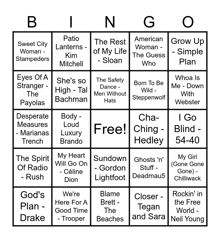 This bingo card has a free space and 79 words: S.O.S. (Sawed Off Shotgun) - The Glorious Sons, Working for the Weekend - Loverboy, The Rest of My Life - Sloan, Complicated - Avril Lavigne, 1234 - Feist, Take Me Away - Fefe Dobson, Sunglasses at Night - Corey Hart, Bobcaygeon - The Tragically Hip, Making It Work - Doug and the Slugs, Can't Feel My Face - The Weeknd, Challengers - The New Pornographers, Informer - Snow, American Woman - The Guess Who, Sweet City Woman - Stampeders, Ready to Start - Arcade Fire, Eyes Of A Stranger - The Payolas, Feeling Good - Michael Bublé, My Heart Will Go On - Céline Dion, One Week - Barenaked Ladies, I Go Blind - 54-40, Stitches - Shawn Mendes, Grow Up - Simple Plan, Desperate Measures - Marianas Trench, The Safety Dance - Men Without Hats, She's so High - Tal Bachman, Hasn't Hit Me Yet - Blue Rodeo, Takin' Care Of Business - Bachman-Turner Overdrive, Lover's In A Dangerous Time - Bruce Cockburn, I'm Like A Bird - Nelly Furtado, Love Is - Alannah Myles, Whoa Is Me - Down With Webster, Skinnamarink - Sharon Lois & Bram, Blame Brett - The Beaches, Pinball King - Terra Lightfoot, God's Plan - Drake, Cha-Ching - Hedley, Your Daddy Don't Know - Toronto, Ordinary Day - Great Big Sea, The Hockey Song - Stompin' Tom Connors, Rockin' in the Free World - Neil Young, Girl With A Problem - The Northern Pikes, Innocence - Harlequin, Summer Of ‘69 - Bryan Adams, Leather Jacket - Arkells, Feel It Again - Honeymoon Suite, Patio Lanterns - Kim Mitchell, Tongue Tied - Faber Drive, Baby - Justin Bieber Ludacris, Greedy - Tate McRae, How You Remind Me - Nickleback, My Girl (Gone Gone Gone) - Chilliwack, Body - Loud Luxury Brando, Ghosts 'n' Stuff - Deadmau5, Call Me Maybe - Carly Rae Jepsen, Push - Moist, Big Yellow Taxi - Joni Mitchell, Riot - Three Days Grace, When She Loved Me - Sarah McLachlan, Lay It on the Line - Triumph, Sundown - Gordon Lightfoot, Born To Be Wild - Steppenwolf, Roller - April Wine, Help I'm Alive - Metric, Paralyzer - Finger Eleven, Sucks To Be You - Prozzak, Tired of Waiting - The Trews, Ironic - Alanis Morissette, Man! I Feel Like A Woman! - Shania Twain, Red Hands - Walk off the Earth, The Spirit Of Radio - Rush, We're Here For A Good Time - Trooper, Superman's Dead - Our Lady Peace, I'm An Adult Now - The Pursuit Of Happiness, Drinking in L.A - Bran Van 3000, In Too Deep - Sum 41, Closer - Tegan and Sara, Hallelujah - Leonard Cohen, Good Mother - Jann Arden and Hayloft - Mother Mother.