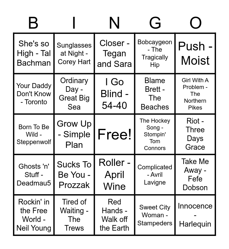This bingo card has a free space and 79 words: The Safety Dance - Men Without Hats, Eyes Of A Stranger - The Payolas, Closer - Tegan and Sara, Lover's In A Dangerous Time - Bruce Cockburn, Pinball King - Terra Lightfoot, My Girl (Gone Gone Gone) - Chilliwack, Ready to Start - Arcade Fire, Hasn't Hit Me Yet - Blue Rodeo, Drinking in L.A - Bran Van 3000, Skinnamarink - Sharon Lois & Bram, Feel It Again - Honeymoon Suite, Paralyzer - Finger Eleven, Bobcaygeon - The Tragically Hip, She's so High - Tal Bachman, Hallelujah - Leonard Cohen, Your Daddy Don't Know - Toronto, Lay It on the Line - Triumph, Sucks To Be You - Prozzak, Making It Work - Doug and the Slugs, Riot - Three Days Grace, Baby - Justin Bieber Ludacris, Push - Moist, Born To Be Wild - Steppenwolf, I Go Blind - 54-40, Ordinary Day - Great Big Sea, How You Remind Me - Nickleback, Hayloft - Mother Mother, When She Loved Me - Sarah McLachlan, Body - Loud Luxury Brando, Leather Jacket - Arkells, Girl With A Problem - The Northern Pikes, Informer - Snow, Red Hands - Walk off the Earth, 1234 - Feist, Rockin' in the Free World - Neil Young, The Hockey Song - Stompin' Tom Connors, We're Here For A Good Time - Trooper, Whoa Is Me - Down With Webster, Superman's Dead - Our Lady Peace, Innocence - Harlequin, Big Yellow Taxi - Joni Mitchell, Cha-Ching - Hedley, I'm An Adult Now - The Pursuit Of Happiness, The Spirit Of Radio - Rush, Call Me Maybe - Carly Rae Jepsen, Sunglasses at Night - Corey Hart, I'm Like A Bird - Nelly Furtado, In Too Deep - Sum 41, Summer Of ‘69 - Bryan Adams, Challengers - The New Pornographers, Take Me Away - Fefe Dobson, Grow Up - Simple Plan, Complicated - Avril Lavigne, Greedy - Tate McRae, Patio Lanterns - Kim Mitchell, American Woman - The Guess Who, Ironic - Alanis Morissette, S.O.S. (Sawed Off Shotgun) - The Glorious Sons, Takin' Care Of Business - Bachman-Turner Overdrive, Roller - April Wine, Blame Brett - The Beaches, Stitches - Shawn Mendes, The Rest of My Life - Sloan, Good Mother - Jann Arden, Man! I Feel Like A Woman! - Shania Twain, Can't Feel My Face - The Weeknd, My Heart Will Go On - Céline Dion, Desperate Measures - Marianas Trench, Sundown - Gordon Lightfoot, Ghosts 'n' Stuff - Deadmau5, Tired of Waiting - The Trews, Love Is - Alannah Myles, Tongue Tied - Faber Drive, Working for the Weekend - Loverboy, Feeling Good - Michael Bublé, Sweet City Woman - Stampeders, One Week - Barenaked Ladies, God's Plan - Drake and Help I'm Alive - Metric.