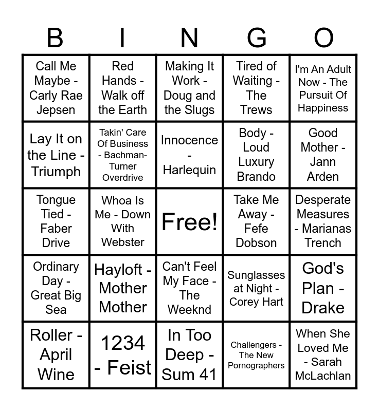 This bingo card has a free space and 79 words: I Go Blind - 54-40, Closer - Tegan and Sara, Making It Work - Doug and the Slugs, Patio Lanterns - Kim Mitchell, We're Here For A Good Time - Trooper, Baby - Justin Bieber Ludacris, Sweet City Woman - Stampeders, One Week - Barenaked Ladies, Push - Moist, Sundown - Gordon Lightfoot, Riot - Three Days Grace, Working for the Weekend - Loverboy, Tired of Waiting - The Trews, Call Me Maybe - Carly Rae Jepsen, Man! I Feel Like A Woman! - Shania Twain, Lay It on the Line - Triumph, Ironic - Alanis Morissette, Hayloft - Mother Mother, How You Remind Me - Nickleback, Desperate Measures - Marianas Trench, Big Yellow Taxi - Joni Mitchell, I'm An Adult Now - The Pursuit Of Happiness, Tongue Tied - Faber Drive, Innocence - Harlequin, Takin' Care Of Business - Bachman-Turner Overdrive, The Spirit Of Radio - Rush, Born To Be Wild - Steppenwolf, Lover's In A Dangerous Time - Bruce Cockburn, Rockin' in the Free World - Neil Young, Sucks To Be You - Prozzak, Good Mother - Jann Arden, Informer - Snow, In Too Deep - Sum 41, S.O.S. (Sawed Off Shotgun) - The Glorious Sons, Roller - April Wine, Take Me Away - Fefe Dobson, I'm Like A Bird - Nelly Furtado, The Rest of My Life - Sloan, Leather Jacket - Arkells, When She Loved Me - Sarah McLachlan, Skinnamarink - Sharon Lois & Bram, Summer Of ‘69 - Bryan Adams, American Woman - The Guess Who, Hasn't Hit Me Yet - Blue Rodeo, Complicated - Avril Lavigne, Red Hands - Walk off the Earth, The Safety Dance - Men Without Hats, Cha-Ching - Hedley, Ghosts 'n' Stuff - Deadmau5, Superman's Dead - Our Lady Peace, God's Plan - Drake, Whoa Is Me - Down With Webster, Sunglasses at Night - Corey Hart, My Heart Will Go On - Céline Dion, Drinking in L.A - Bran Van 3000, Hallelujah - Leonard Cohen, Feel It Again - Honeymoon Suite, Pinball King - Terra Lightfoot, Help I'm Alive - Metric, Can't Feel My Face - The Weeknd, Body - Loud Luxury Brando, Bobcaygeon - The Tragically Hip, Paralyzer - Finger Eleven, Greedy - Tate McRae, The Hockey Song - Stompin' Tom Connors, Feeling Good - Michael Bublé, She's so High - Tal Bachman, Your Daddy Don't Know - Toronto, My Girl (Gone Gone Gone) - Chilliwack, Ordinary Day - Great Big Sea, 1234 - Feist, Eyes Of A Stranger - The Payolas, Blame Brett - The Beaches, Ready to Start - Arcade Fire, Grow Up - Simple Plan, Challengers - The New Pornographers, Girl With A Problem - The Northern Pikes, Love Is - Alannah Myles and Stitches - Shawn Mendes.