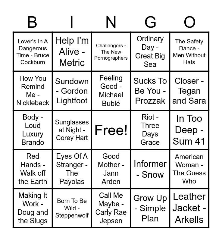 This bingo card has a free space and 79 words: Complicated - Avril Lavigne, Baby - Justin Bieber Ludacris, Challengers - The New Pornographers, Working for the Weekend - Loverboy, Superman's Dead - Our Lady Peace, 1234 - Feist, S.O.S. (Sawed Off Shotgun) - The Glorious Sons, Desperate Measures - Marianas Trench, I Go Blind - 54-40, Pinball King - Terra Lightfoot, Love Is - Alannah Myles, Girl With A Problem - The Northern Pikes, Ordinary Day - Great Big Sea, Lover's In A Dangerous Time - Bruce Cockburn, Cha-Ching - Hedley, How You Remind Me - Nickleback, Takin' Care Of Business - Bachman-Turner Overdrive, Eyes Of A Stranger - The Payolas, Sweet City Woman - Stampeders, In Too Deep - Sum 41, One Week - Barenaked Ladies, The Safety Dance - Men Without Hats, Body - Loud Luxury Brando, Feeling Good - Michael Bublé, Sundown - Gordon Lightfoot, Tired of Waiting - The Trews, Tongue Tied - Faber Drive, Skinnamarink - Sharon Lois & Bram, When She Loved Me - Sarah McLachlan, We're Here For A Good Time - Trooper, Closer - Tegan and Sara, My Heart Will Go On - Céline Dion, Call Me Maybe - Carly Rae Jepsen, Bobcaygeon - The Tragically Hip, Making It Work - Doug and the Slugs, Riot - Three Days Grace, The Rest of My Life - Sloan, Hallelujah - Leonard Cohen, Blame Brett - The Beaches, Leather Jacket - Arkells, Stitches - Shawn Mendes, She's so High - Tal Bachman, Paralyzer - Finger Eleven, Push - Moist, Rockin' in the Free World - Neil Young, Help I'm Alive - Metric, Hayloft - Mother Mother, Roller - April Wine, Hasn't Hit Me Yet - Blue Rodeo, Ironic - Alanis Morissette, American Woman - The Guess Who, Sunglasses at Night - Corey Hart, Informer - Snow, Drinking in L.A - Bran Van 3000, Big Yellow Taxi - Joni Mitchell, Can't Feel My Face - The Weeknd, The Spirit Of Radio - Rush, Your Daddy Don't Know - Toronto, Ready to Start - Arcade Fire, Good Mother - Jann Arden, Sucks To Be You - Prozzak, I'm An Adult Now - The Pursuit Of Happiness, Feel It Again - Honeymoon Suite, Lay It on the Line - Triumph, Innocence - Harlequin, Patio Lanterns - Kim Mitchell, My Girl (Gone Gone Gone) - Chilliwack, I'm Like A Bird - Nelly Furtado, The Hockey Song - Stompin' Tom Connors, Red Hands - Walk off the Earth, Born To Be Wild - Steppenwolf, Summer Of ‘69 - Bryan Adams, Whoa Is Me - Down With Webster, Ghosts 'n' Stuff - Deadmau5, God's Plan - Drake, Grow Up - Simple Plan, Greedy - Tate McRae, Man! I Feel Like A Woman! - Shania Twain and Take Me Away - Fefe Dobson.