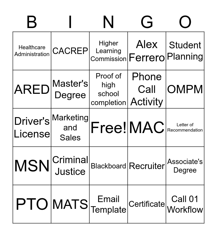 This bingo card has a free space and 27 words: Recruiter, Task, Phone Call Activity, Email Template, ARED, Higher Learning Commission, CACREP, MSN, MAC, Associate's Degree, Driver's License, Alex Ferrero, PTO, MATS, OMPM, Bachelor's Degree, Master's Degree, Proof of high school completion, Criminal Justice, Healthcare Administration, Letter of Recommendation, Certificate, Marketing and Sales, Call 01 Workflow, Blackboard, Student Planning and Filebound.