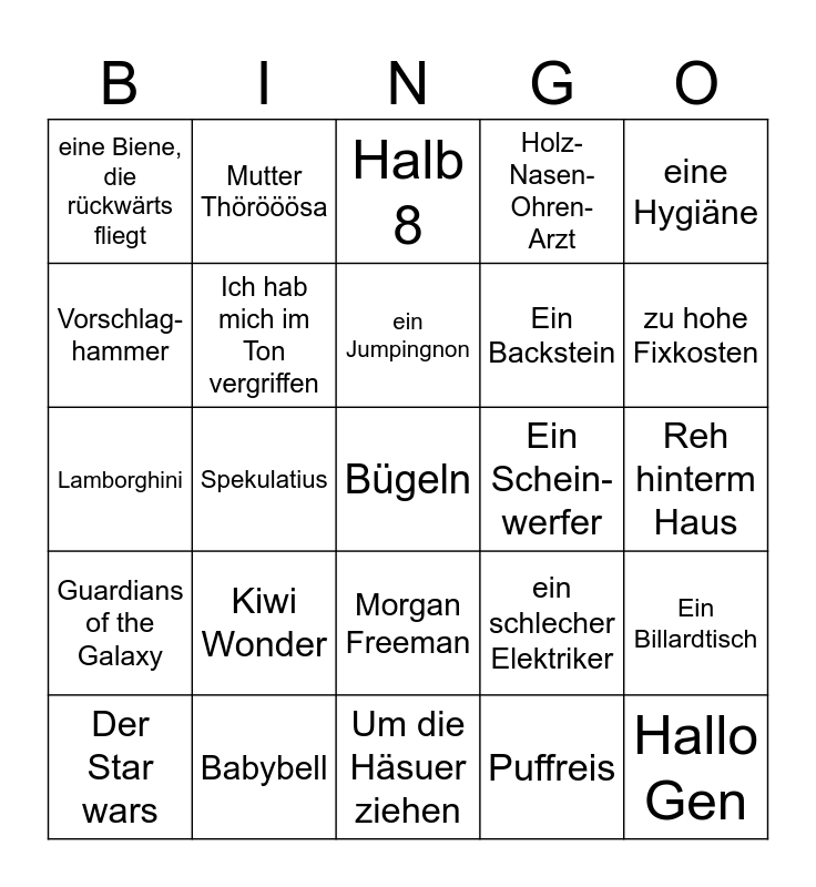 This bingo card has 28 words: Ein Billardtisch, Ein Rockodil, Ein Backstein, Puffreis, Vorschlag-hammer, Halb 8, Mutter Thörööösa, Guardians of the Galaxy, Ein Schein-werfer, Der Star wars, Lamborghini, Holz-Nasen-Ohren-Arzt, Babybell, Um die Häsuer ziehen, zu hohe Fixkosten, Head & Shoulders, Kiwi Wonder, Ich hab mich im Ton vergriffen, ein Jumpingnon, Morgan Freeman, eine Biene, die rückwärts fliegt, Hallo Gen, Bügeln, Spekulatius, Reh hinterm Haus, ein schlecher Elektriker, eine Hygiäne and Slipper.