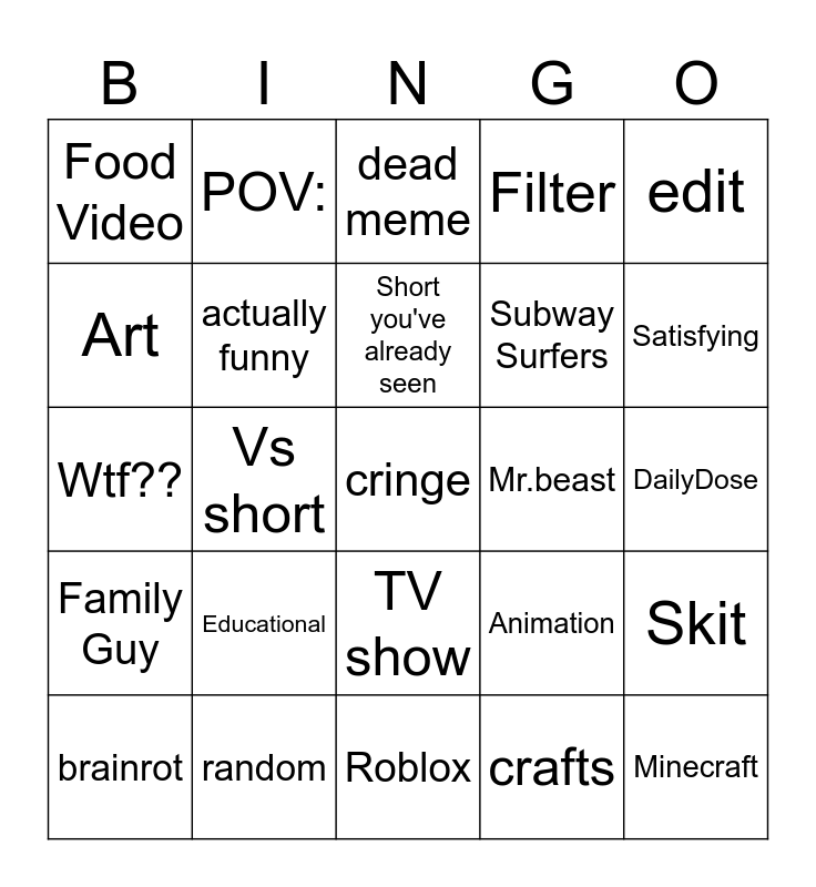 This bingo card has a free space and 29 words: brainrot, perfect loop, Vs short, Starman, Food Video, dead meme, actually funny, Educational, Mr.beast, random, DailyDose, Minecraft, Roblox, crafts, Satisfying, Reaction, TV show, Family Guy, edit, Wtf??, Animation, Annoying Voice, Subway Surfers, Art, Filter, POV:, Skit, Short you've already seen and Music.